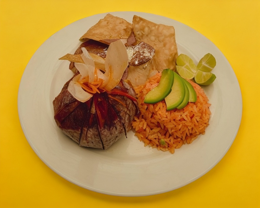 Acompañado de arroz, frijoles con totopos, aguacate, limón, salsa y tortillas.