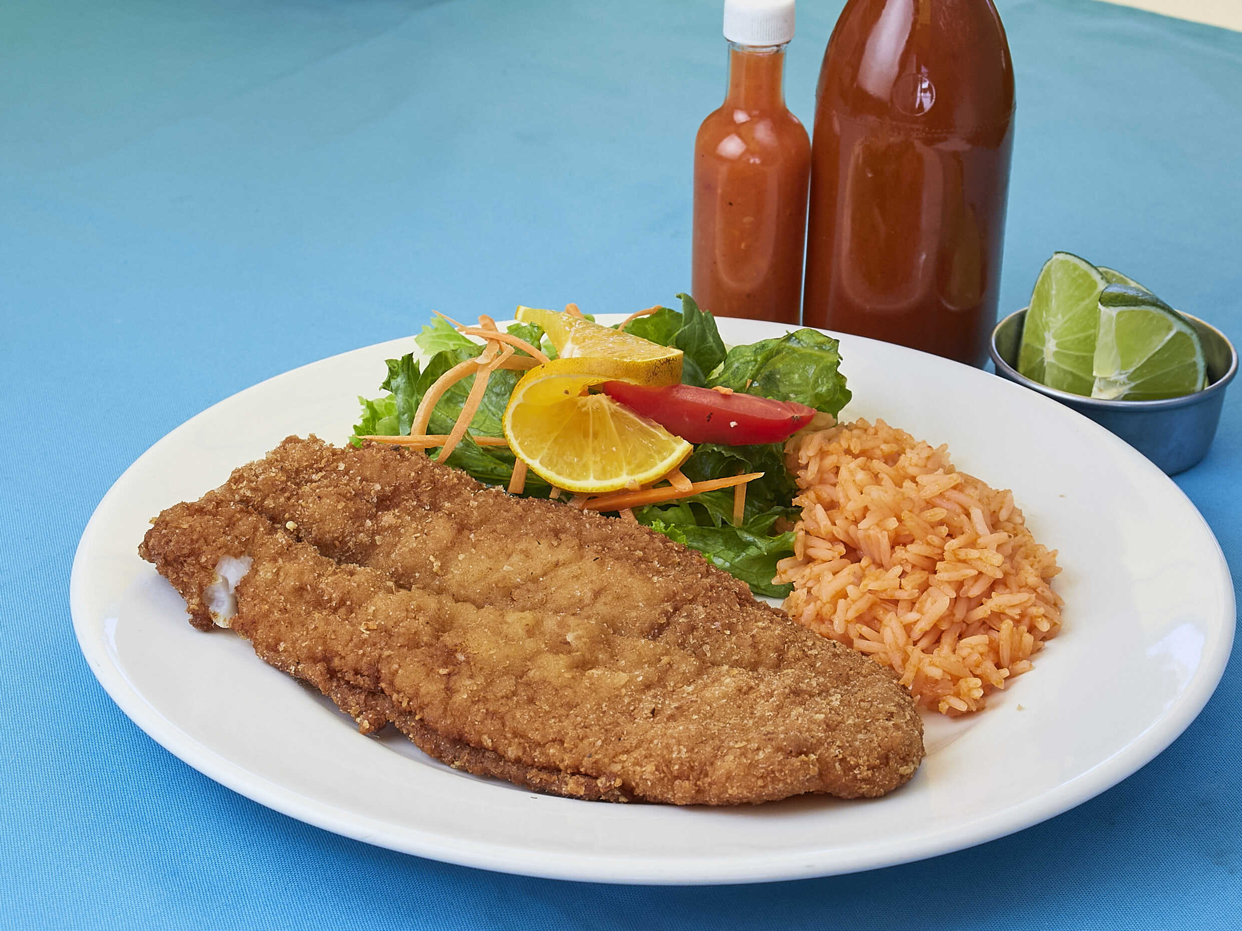 Filete de pescado preparado al gusto. Acompañado de arroz y ensalada mixta.