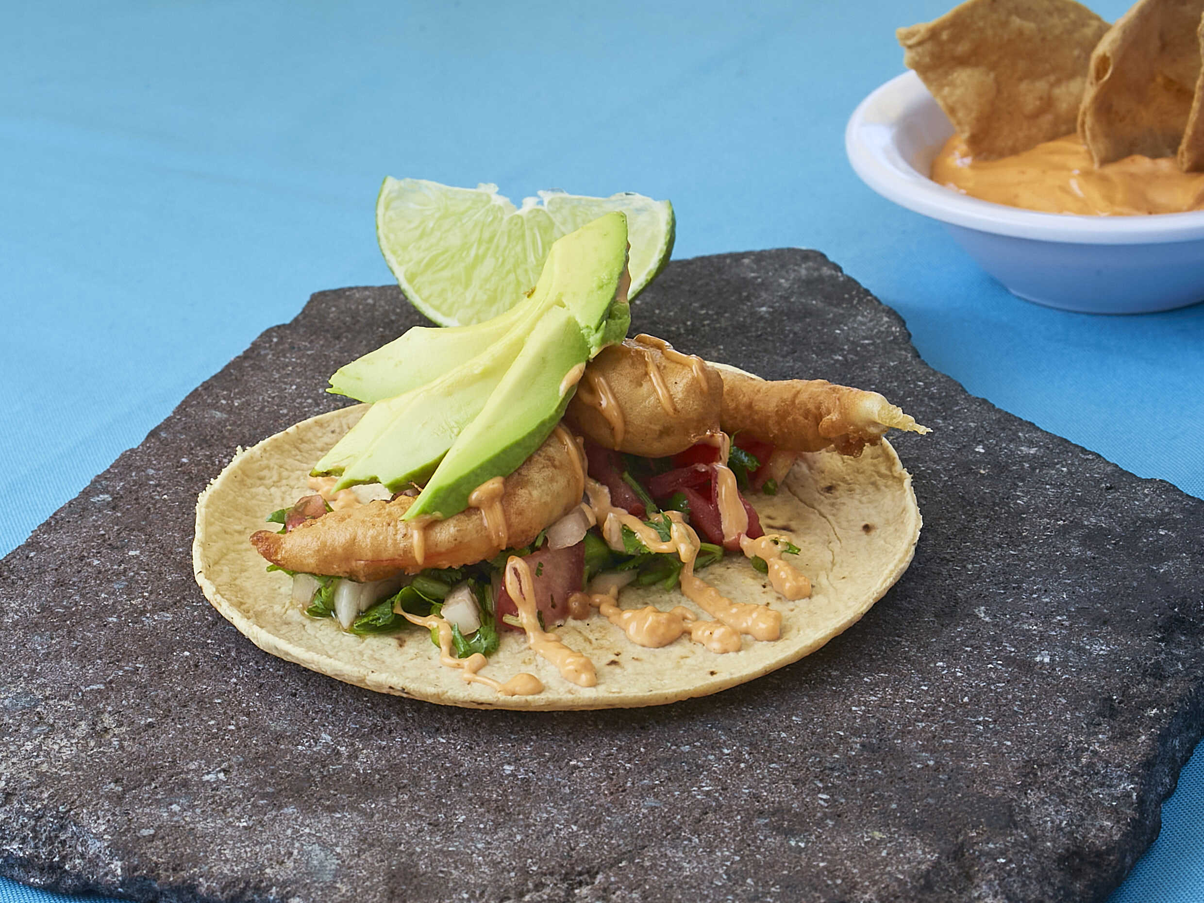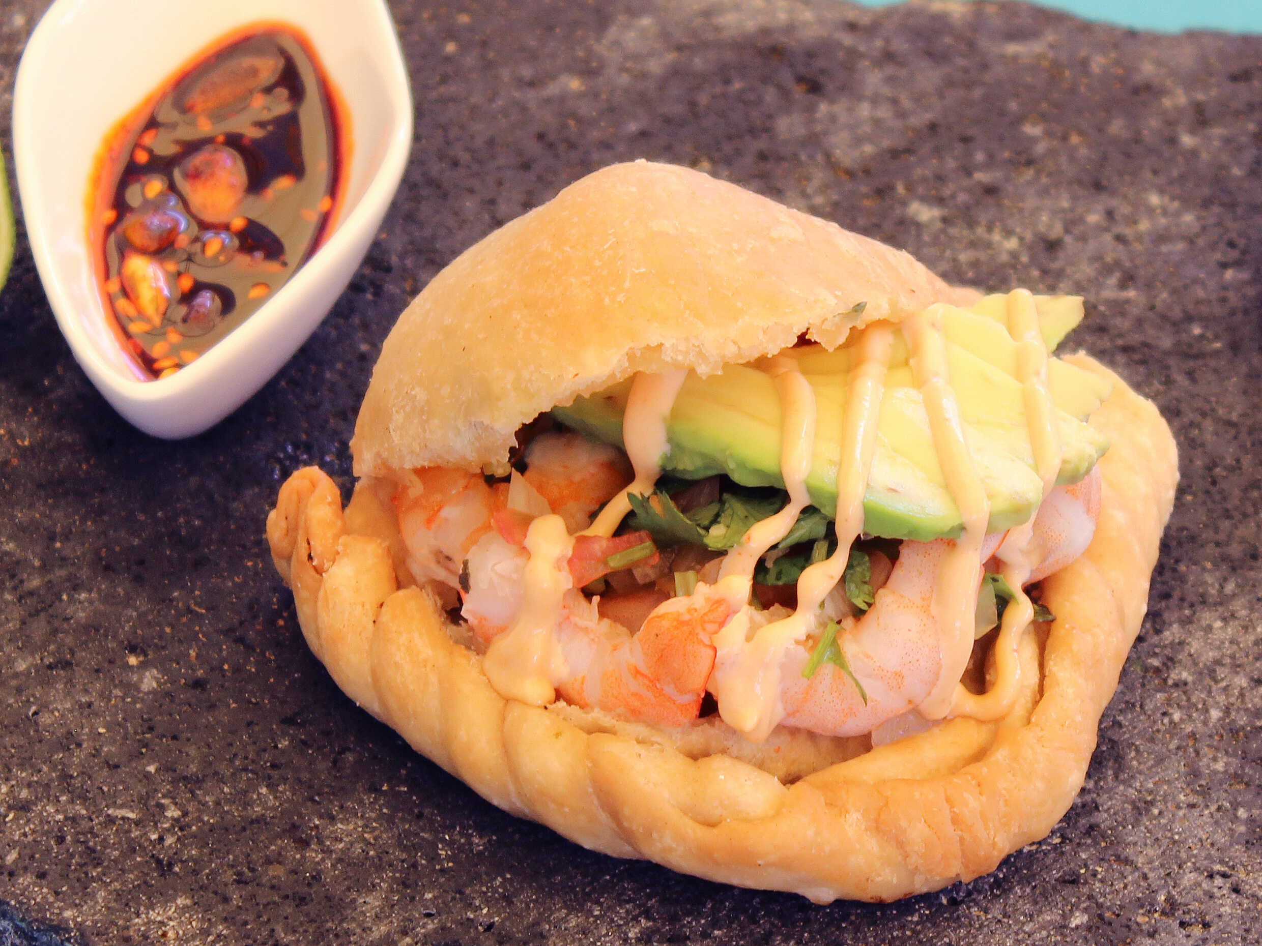 Camarón de mar, sumergido en una tempura, frito y acompañado con pico de gallo, aguacate y aderezo.