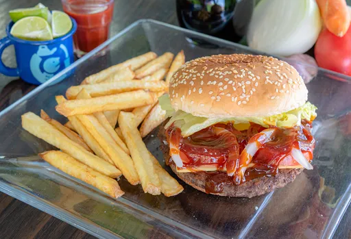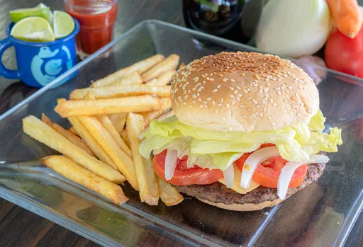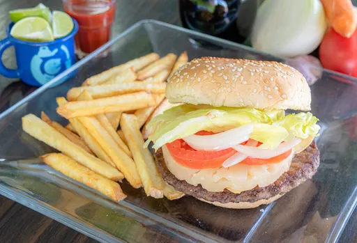 Carne 100% res, 113gr, queso amarillo, lechuga, jitomate, cebolla, pepinillos, pan. Papas fritas, mayonesa, catsup, mostaza y salsa picante.