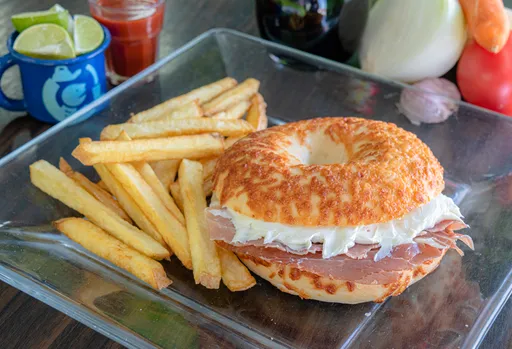 Pan bagel dorado, queso crema, jamón serrano. Papas fritas, catsup, mostaza y salsa picante