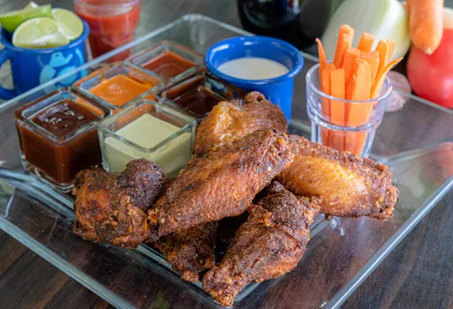 Alitas doradas y jugosas bañadas con una deliciosa salsa a tu elección, acompañadas de aderezo y zanahoria.