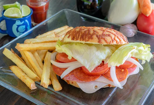 Pan bagel dorado, jamón, salami, pepperoni, lechuga, jitomate, cebolla, papas fritas, mayonesa, catsup, mostaza y salsa picante.