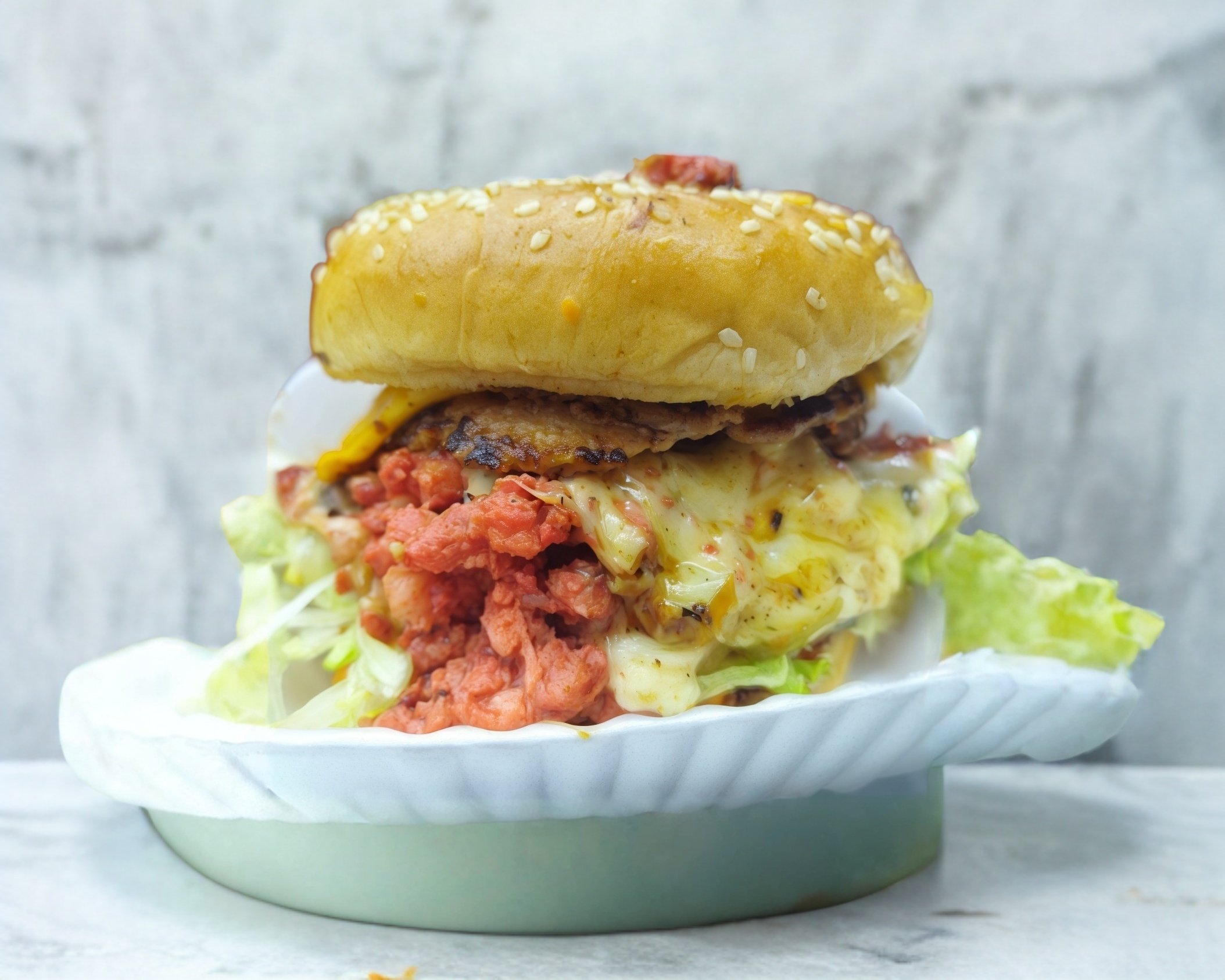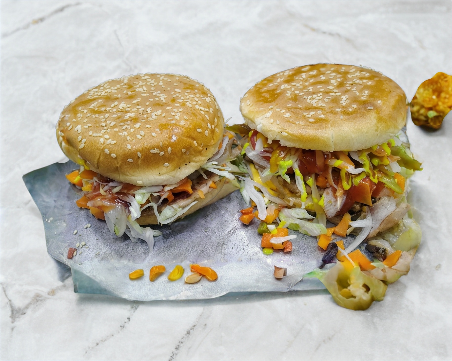 Chicharrón, carne de hamburguesa, lechuga, jitomate y rajas al gusto.