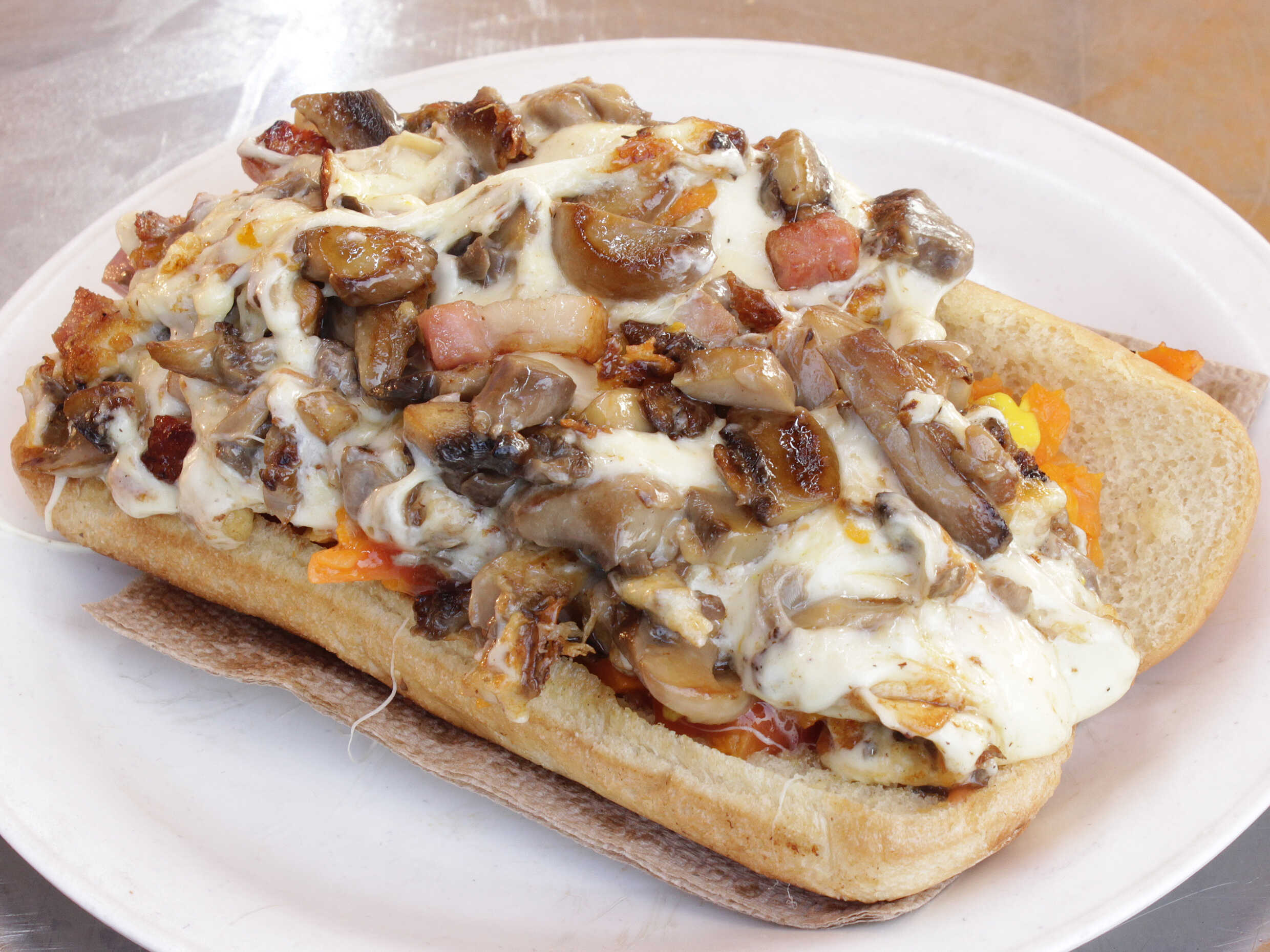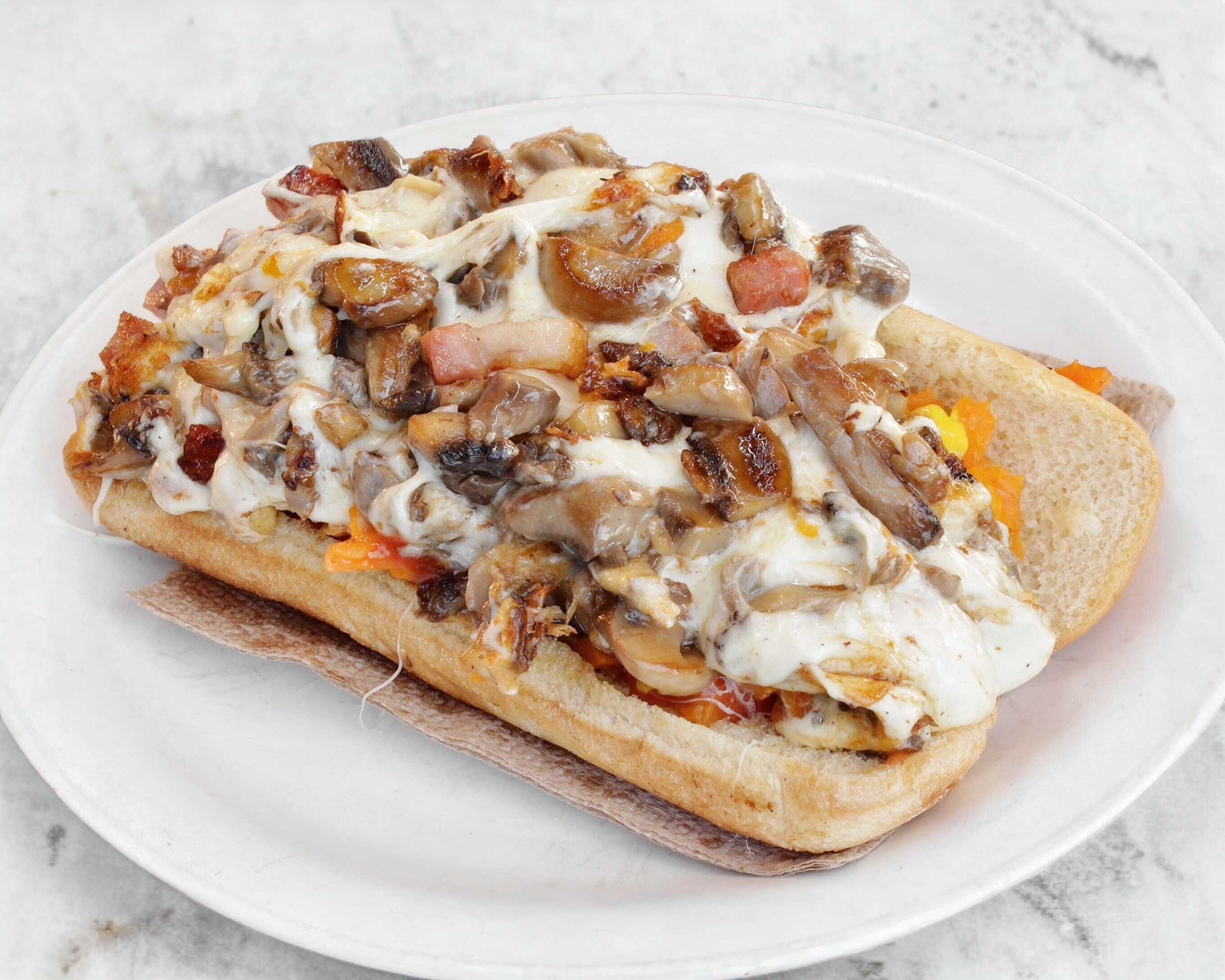 Salchicha, jamón, piña, quesillo, queso amarillo, tocino y champiñones.
