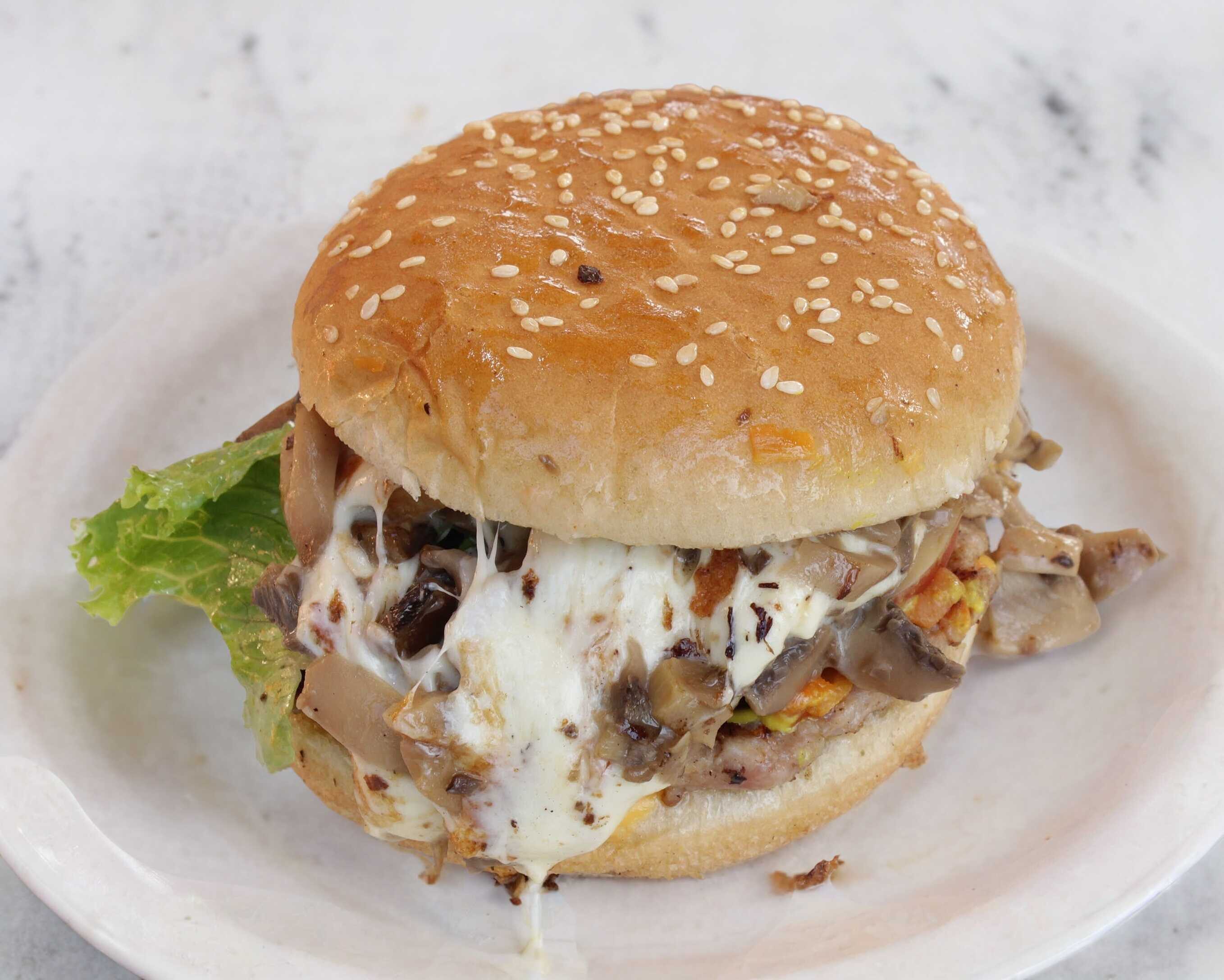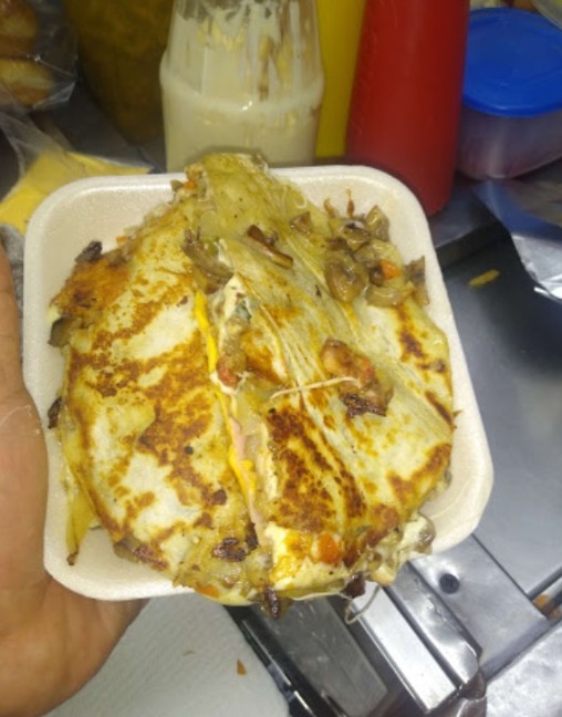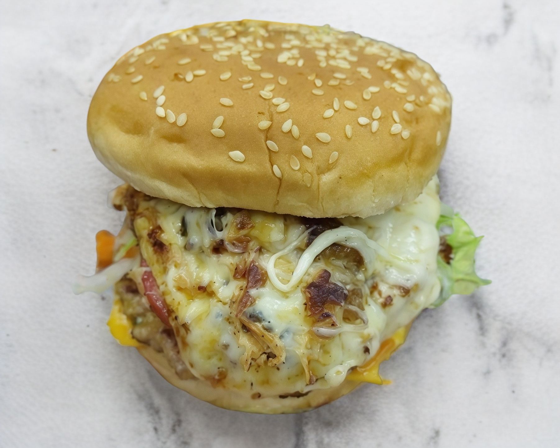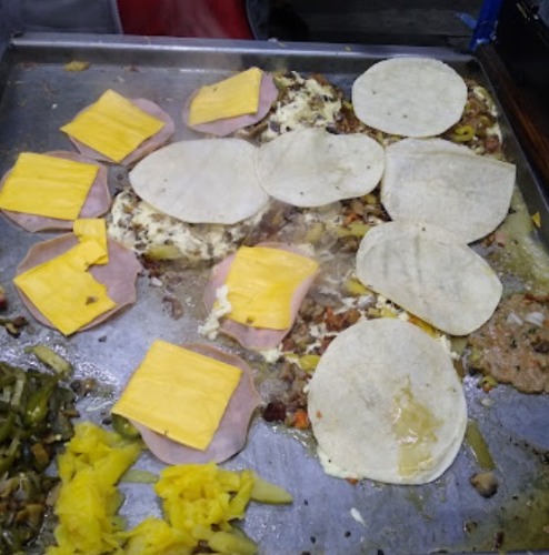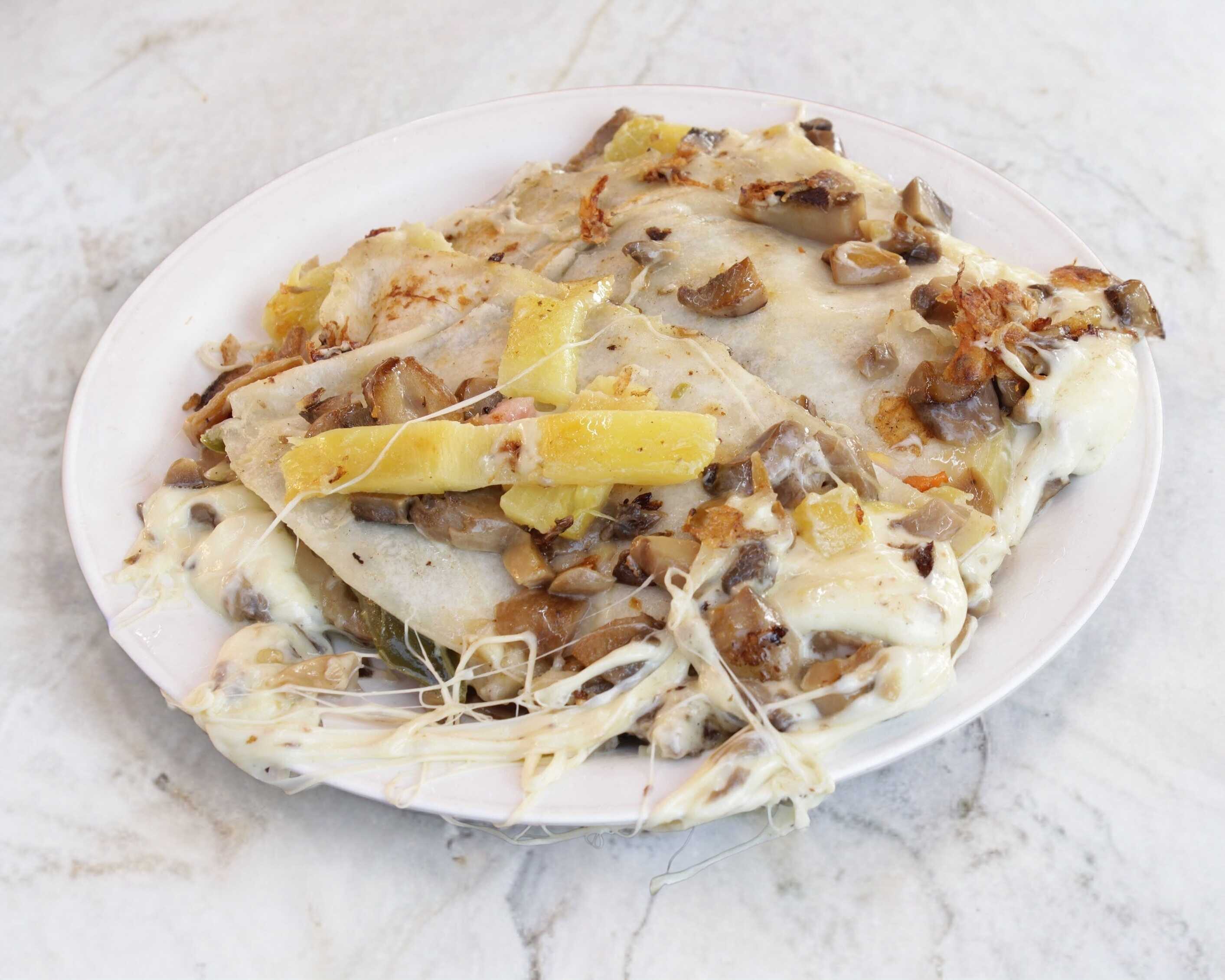 Quesillo, carne de hamburguesa, lechuga, jitomate y rajas.
