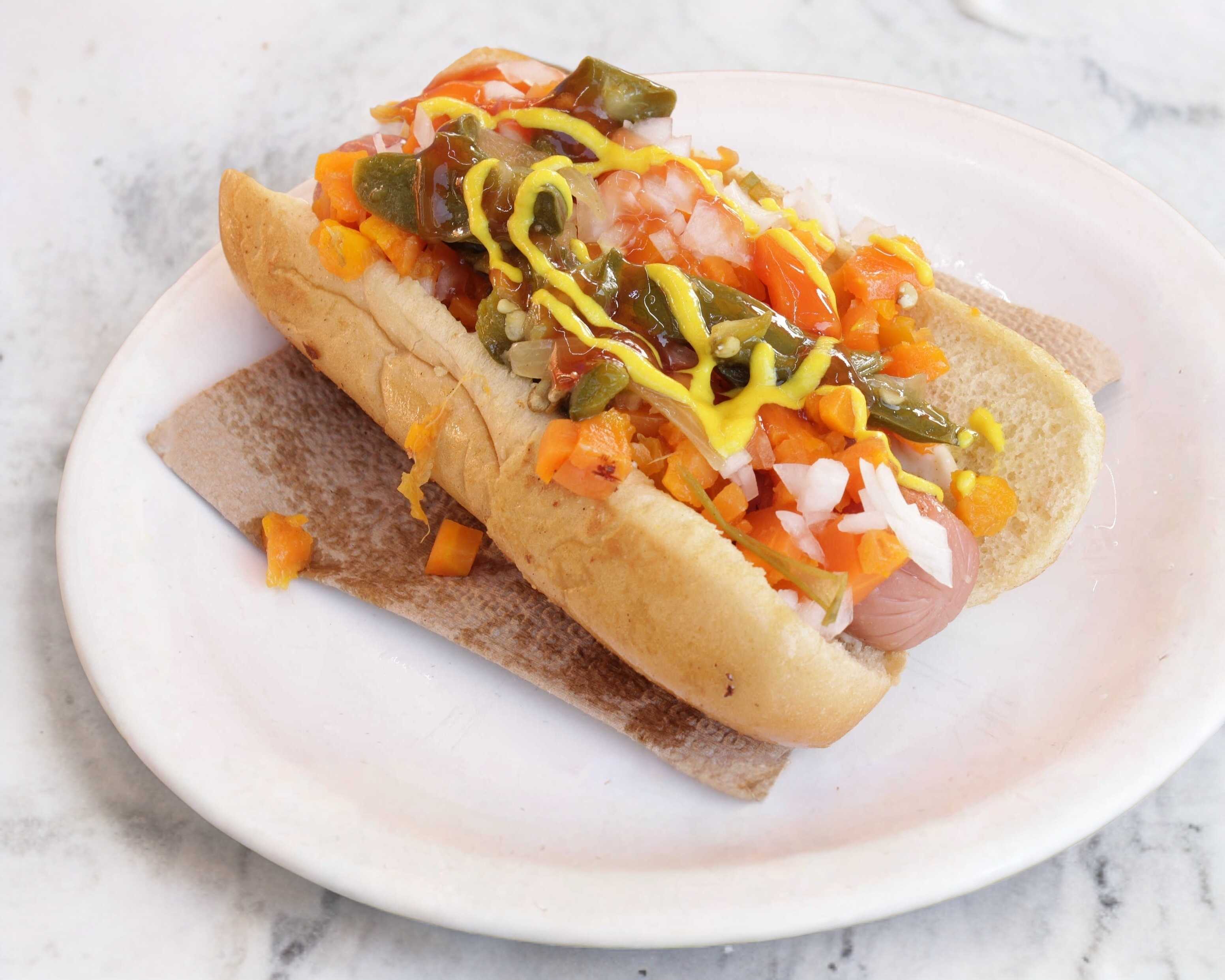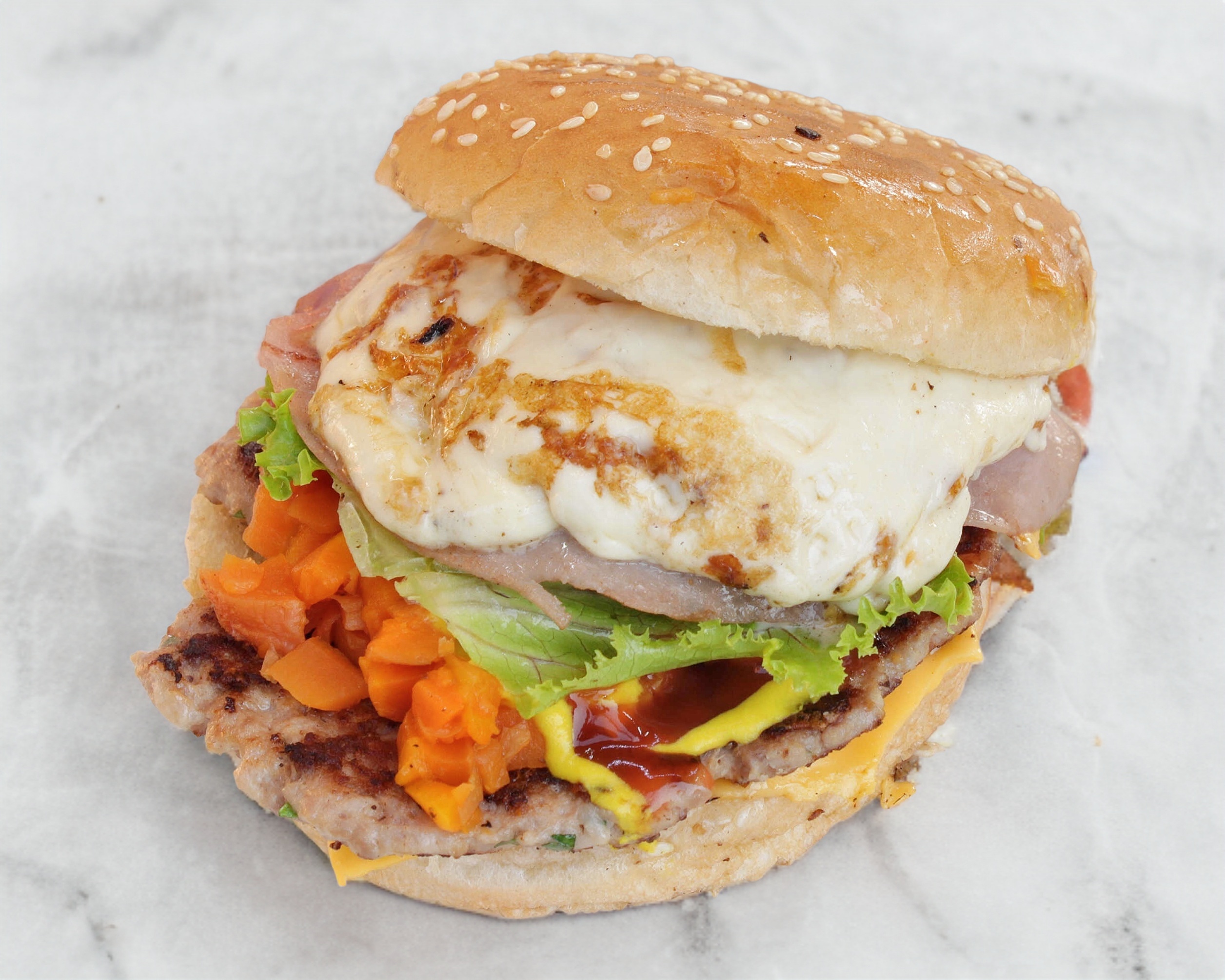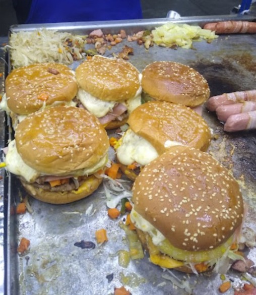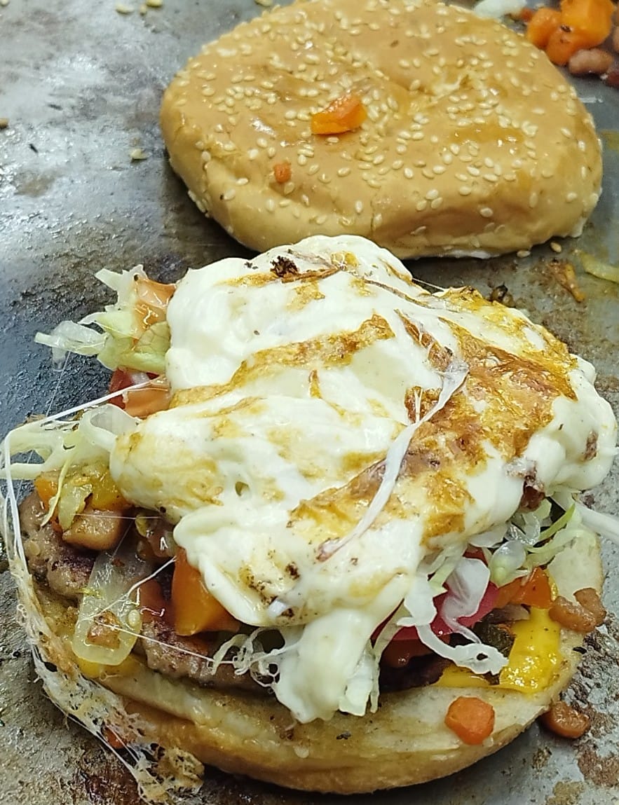Chorizo, carne de hamburguesa, lechuga, jitomate, cebolla, y picante al gusto.