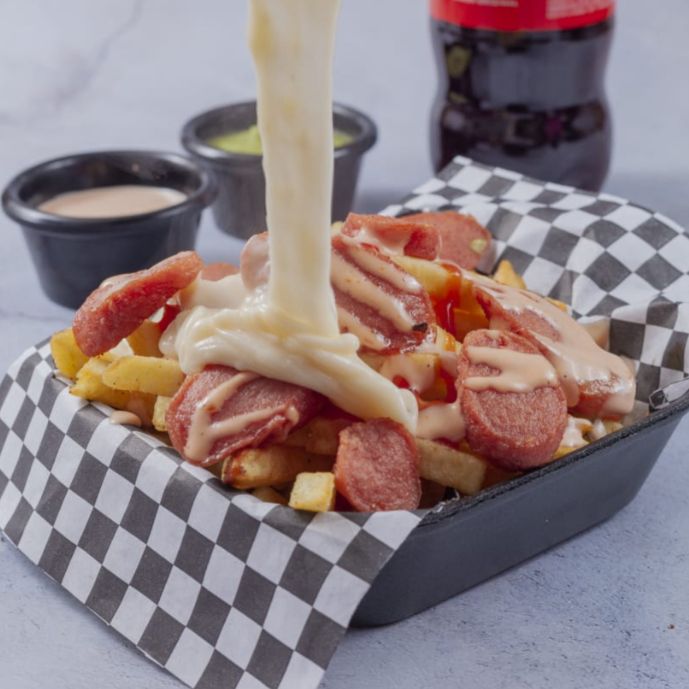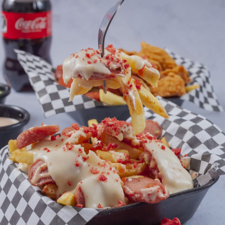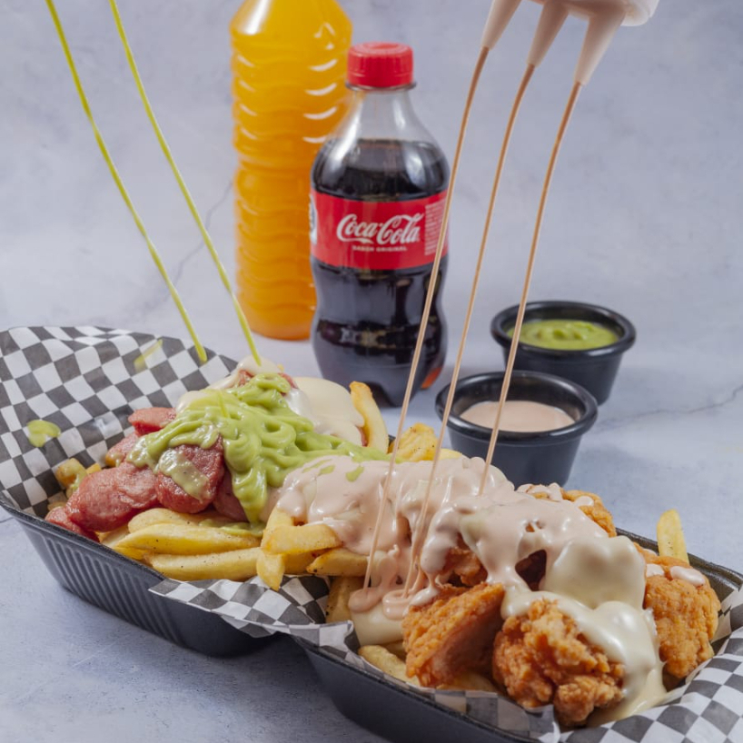 Deliciosas papas acompañadas de salchicha de la chida, boneless vestidos o desvestidos, quesito bein derretido y tus aderezos favoritos