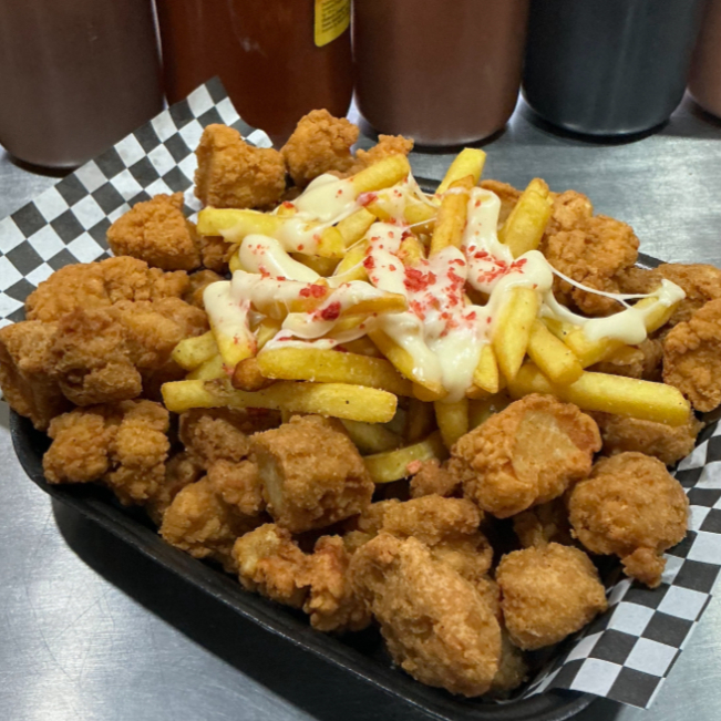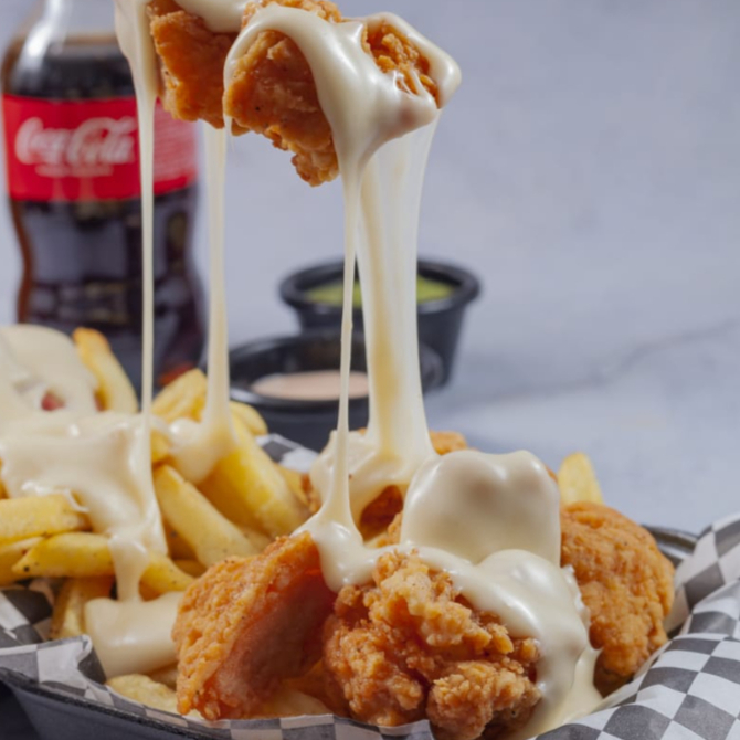 1kg de nuestros boneless hechos en casa, acompañados de papas con queso y tus aderezos favortios