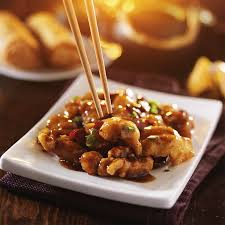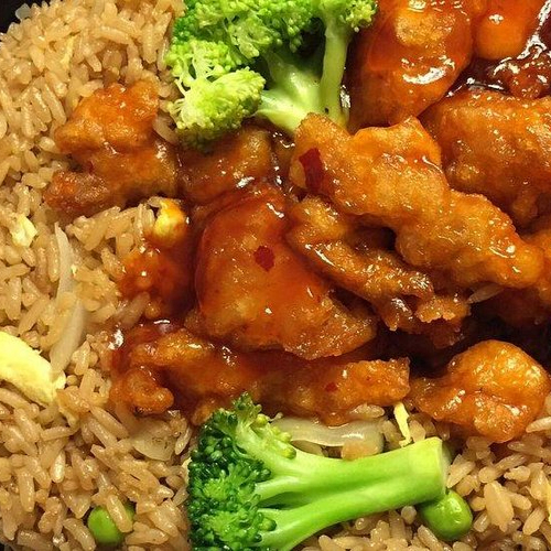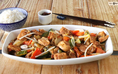 Trozos de pollo salteados al estilo oriental, acompañados de verduras frescas y bañados en una salsa agridulce de la casa.