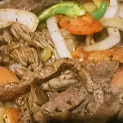 Suaves trozos de res cuidadosamente marinados y cocinados al estilo de la casa, logrando una textura tierna y un sabor que se derrite en la boca.