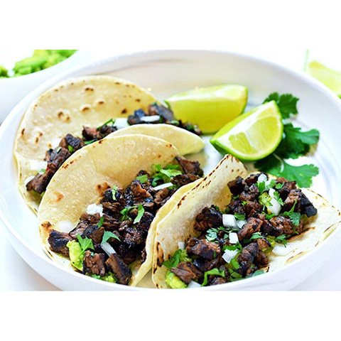 Tres tacos rellenos de carne asada, jugosa y dorada al carbón, servidos en tortillas calientes y acompañados con cebolla, cilantro y salsas de la casa.