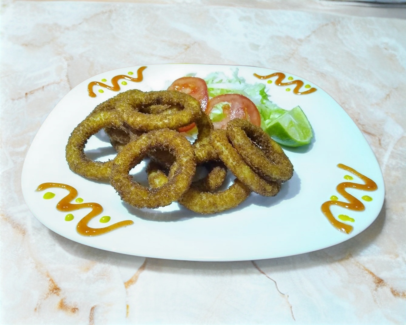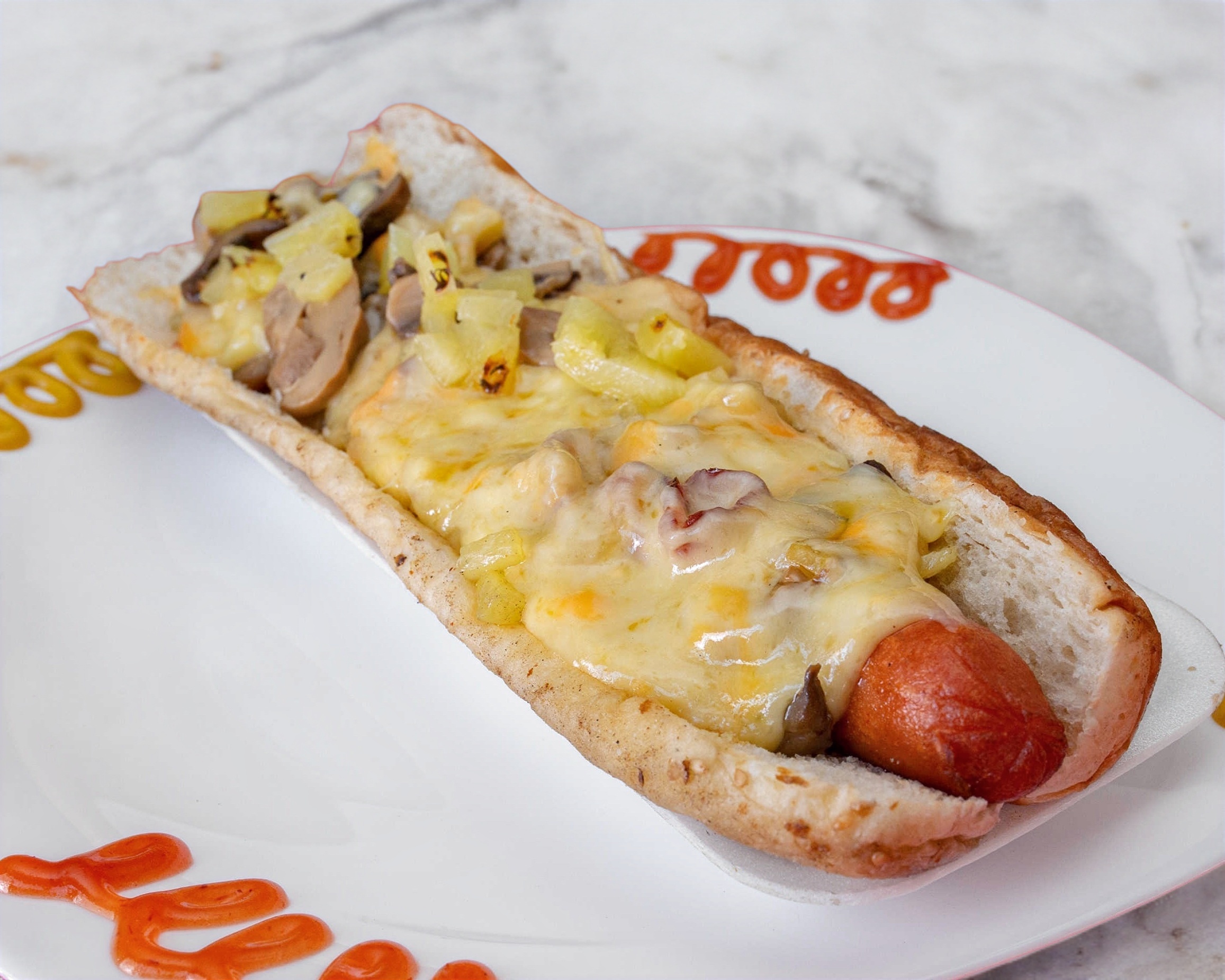 Salchicha de 24cm, queso manchego, tocino, piña, champiñones con jitomate, cebolla y rajas.