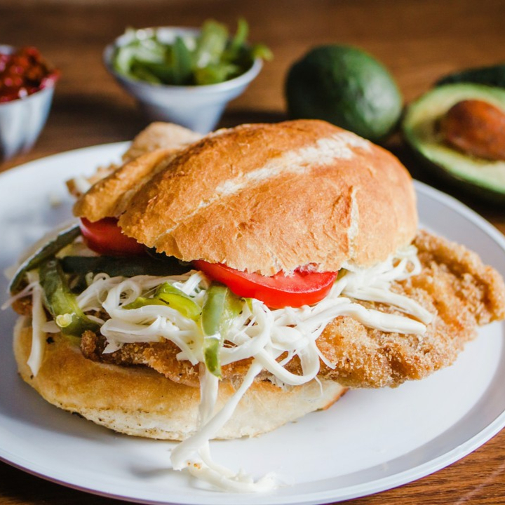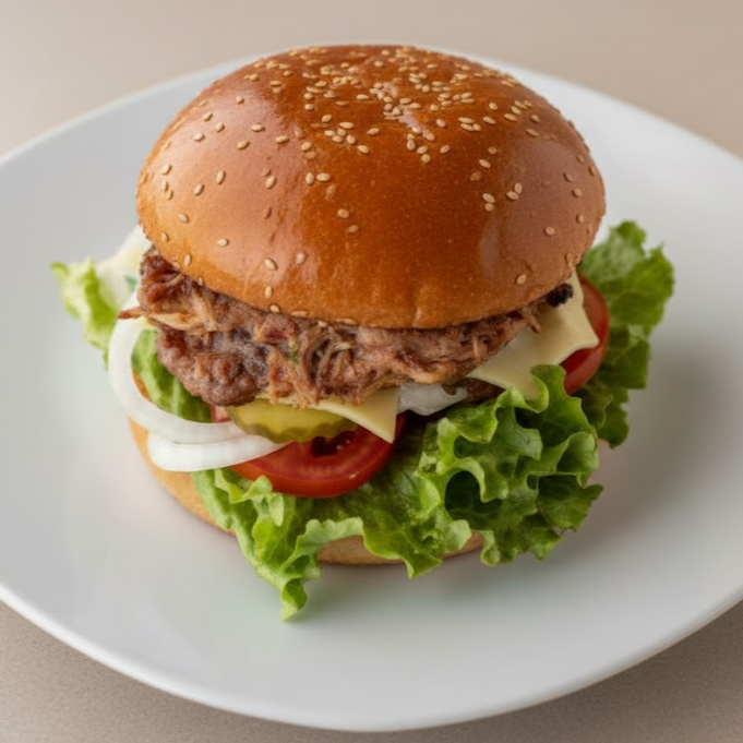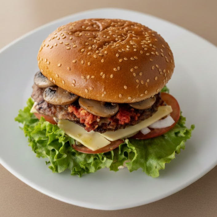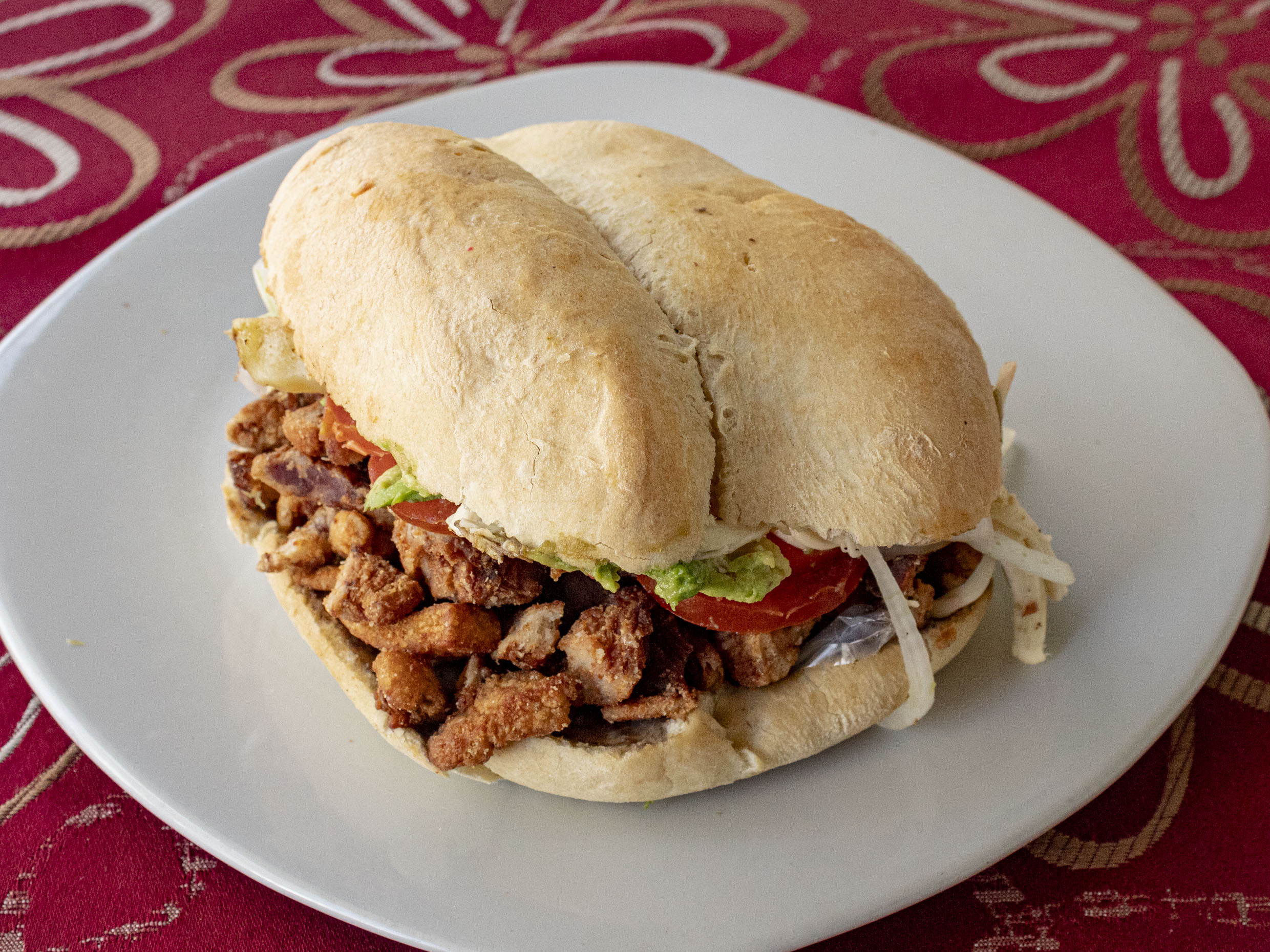 Carne especial de la casa, queso, lechuga, zanahoria, cebolla, jitomate, mayonesa, mostaza, cátsup y picante.