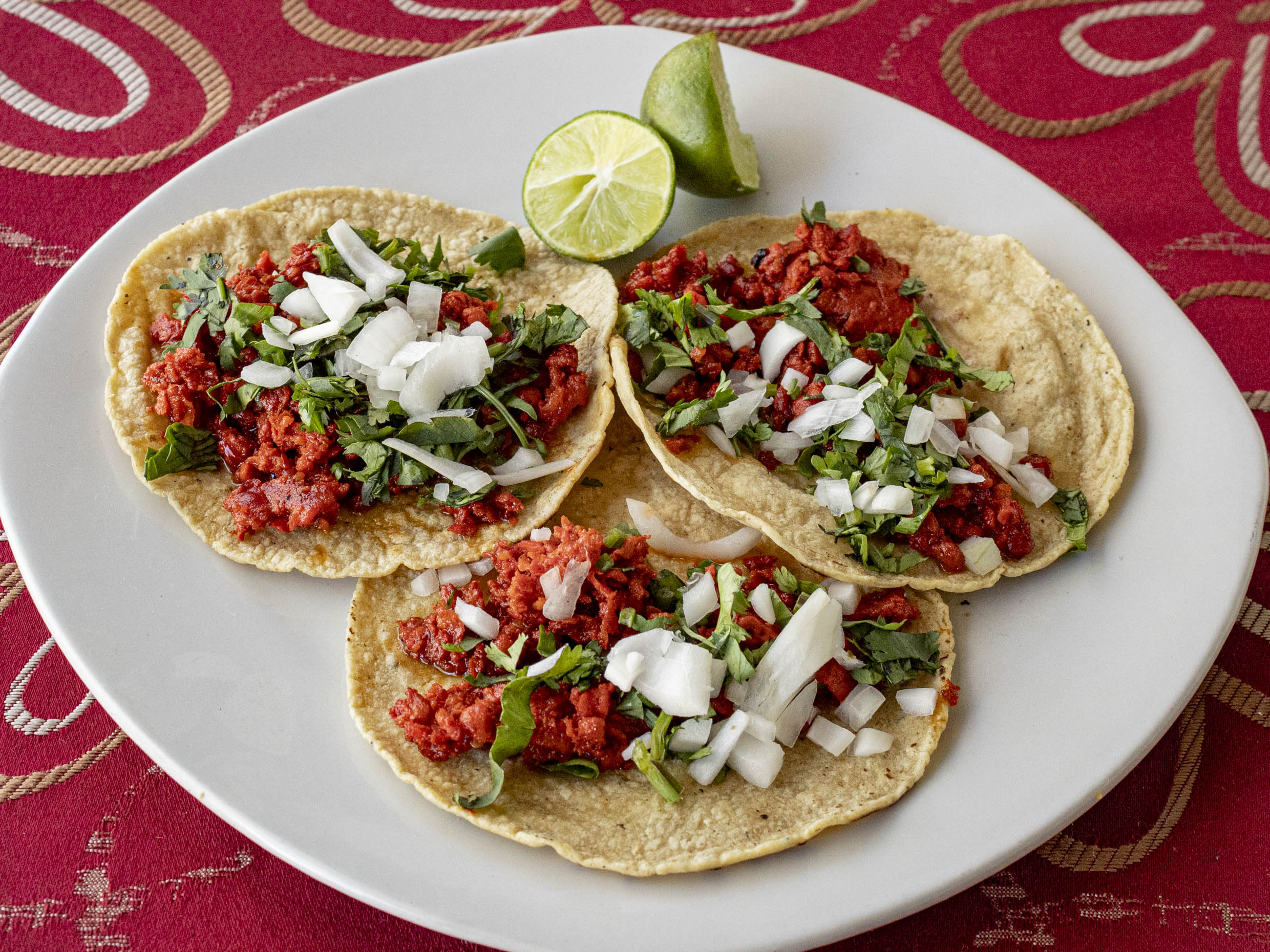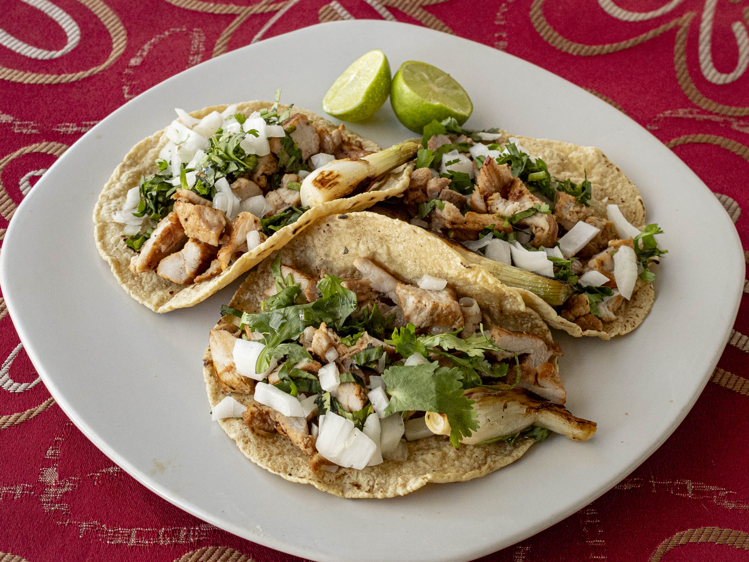 Deliciosa carne de cerdo marinada a la parrilla, servidas en tortillas de maíz recién hechas y acompañadas de cebolla, cilantro y limón.
