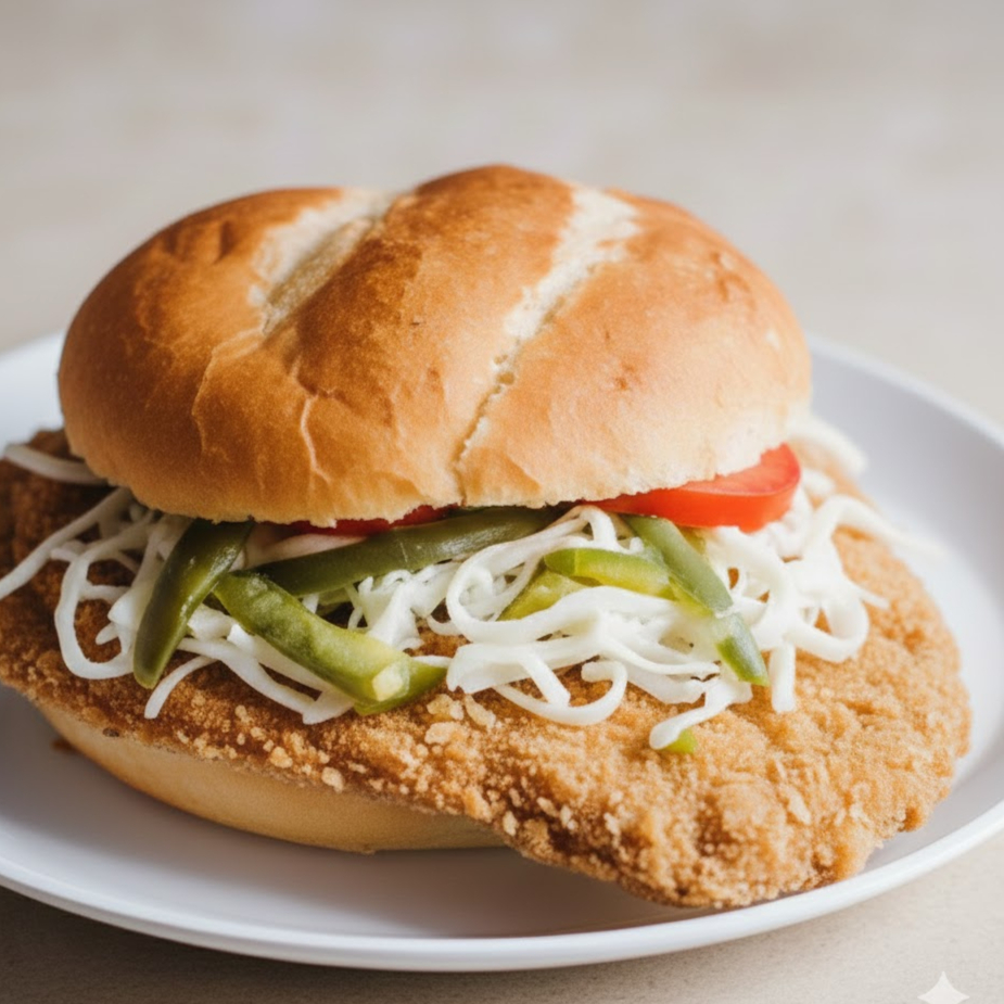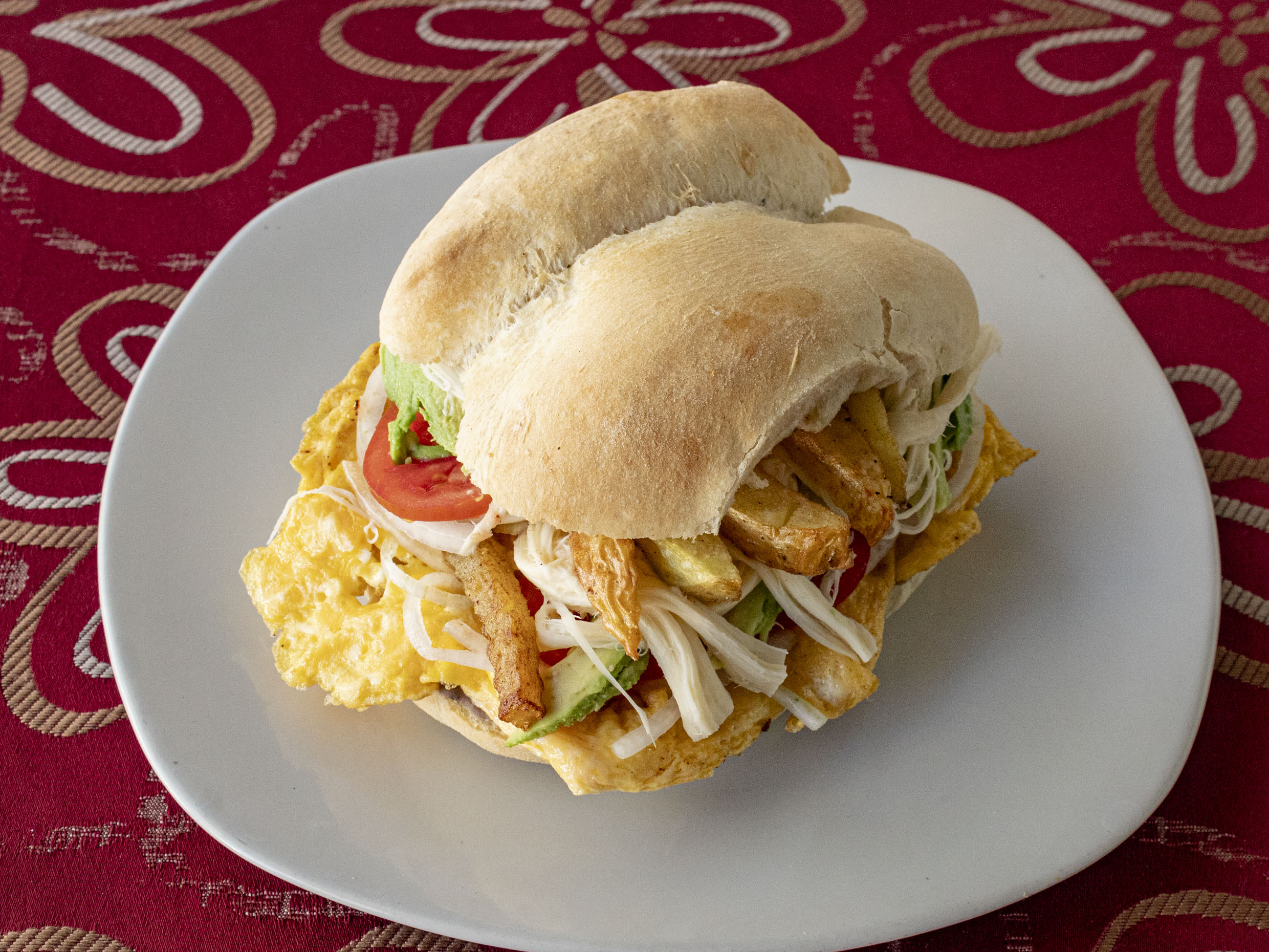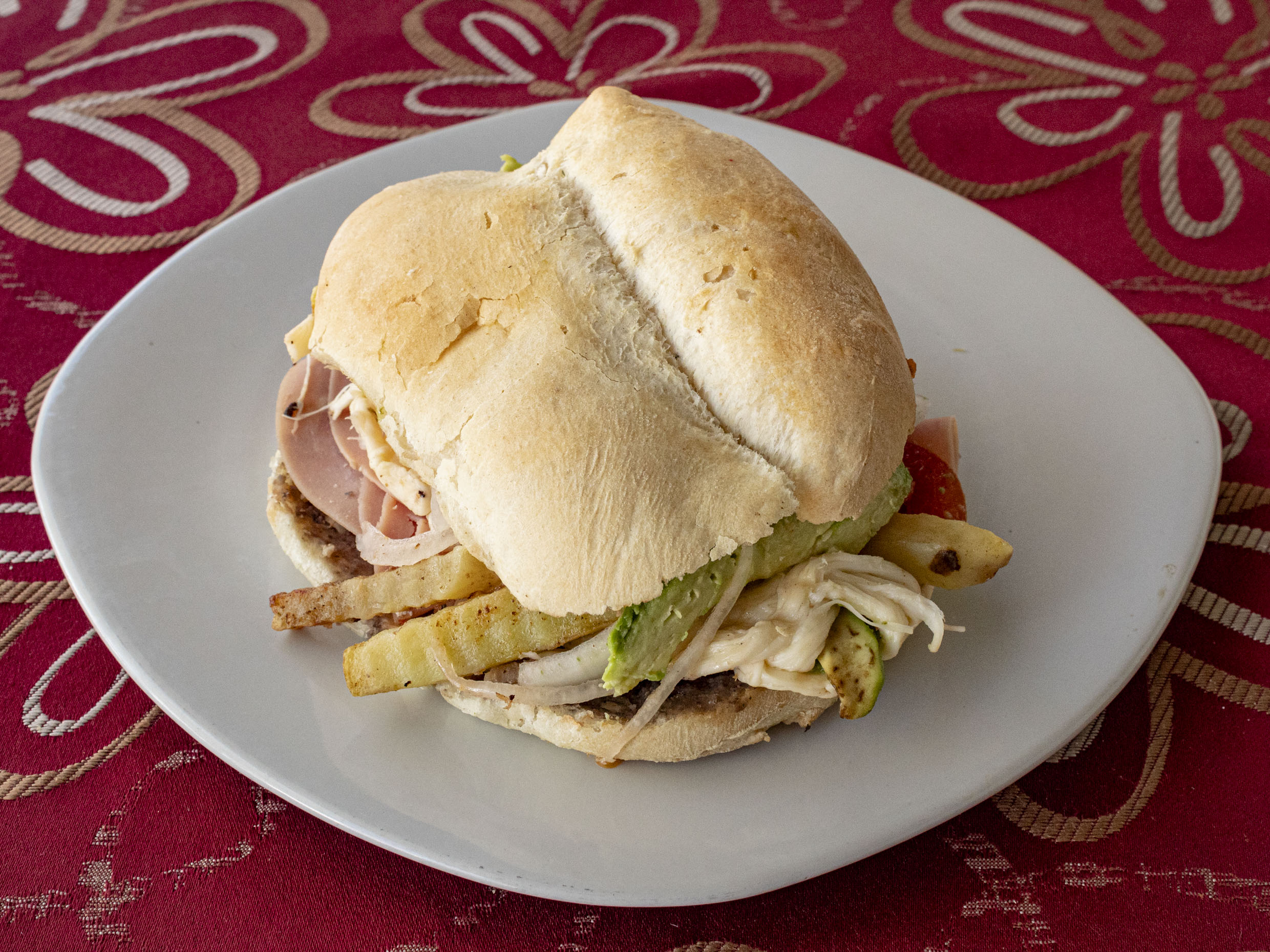 3 Rebanadas de pan, jamón, queso manchego, lechuga, jitomate, aguacate, cebolla, salchicha y aderezo de tocino con pollo; acompañado de papas a la francesa.