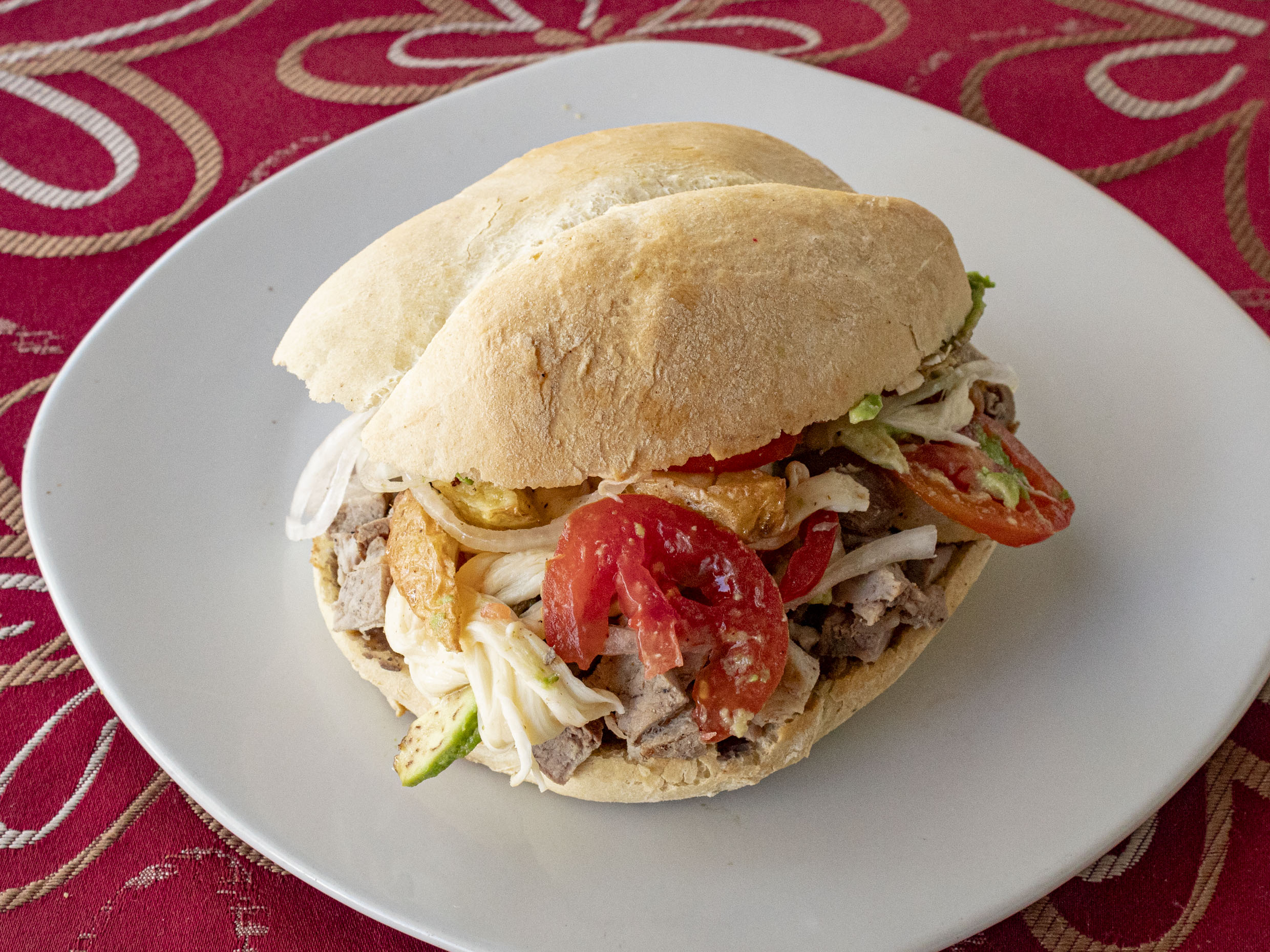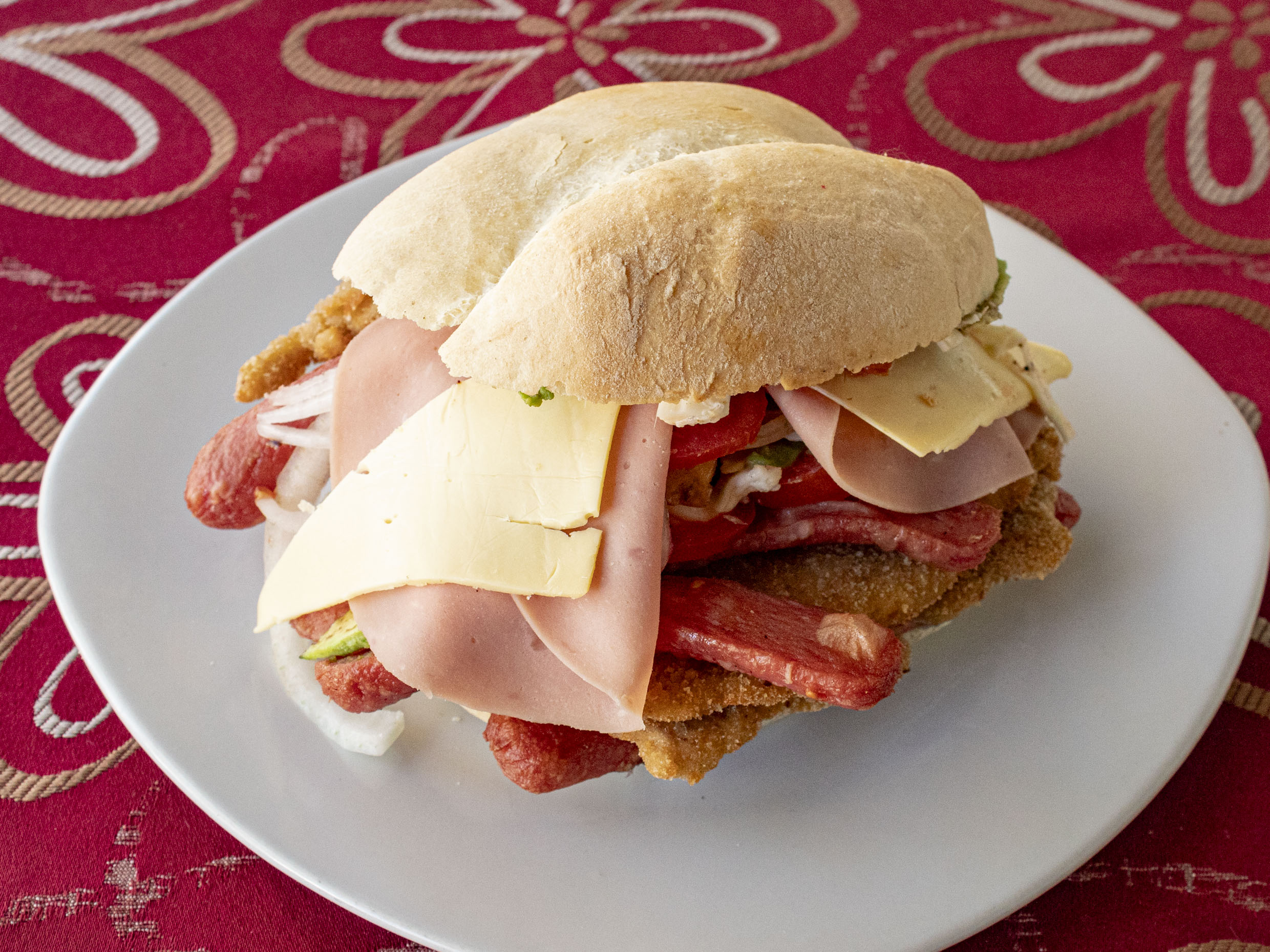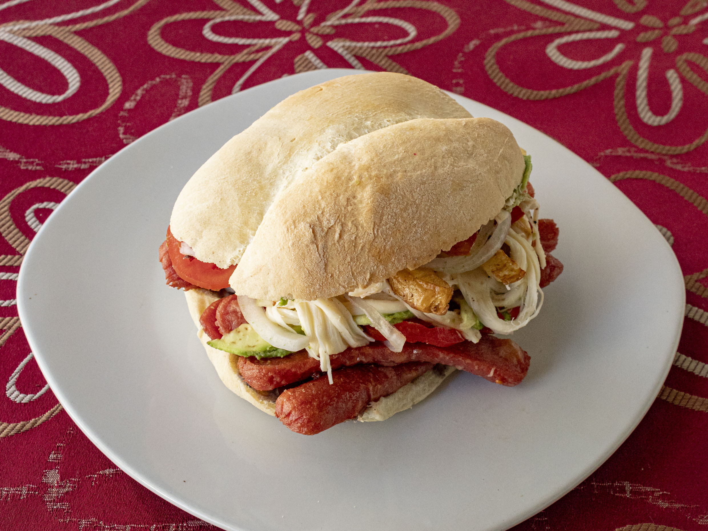 Carne especial de la casa, chorizo, quesillo, lechuga, zanahoria, cebolla, jitomate, mayonesa, mostaza, cátsup y picante.