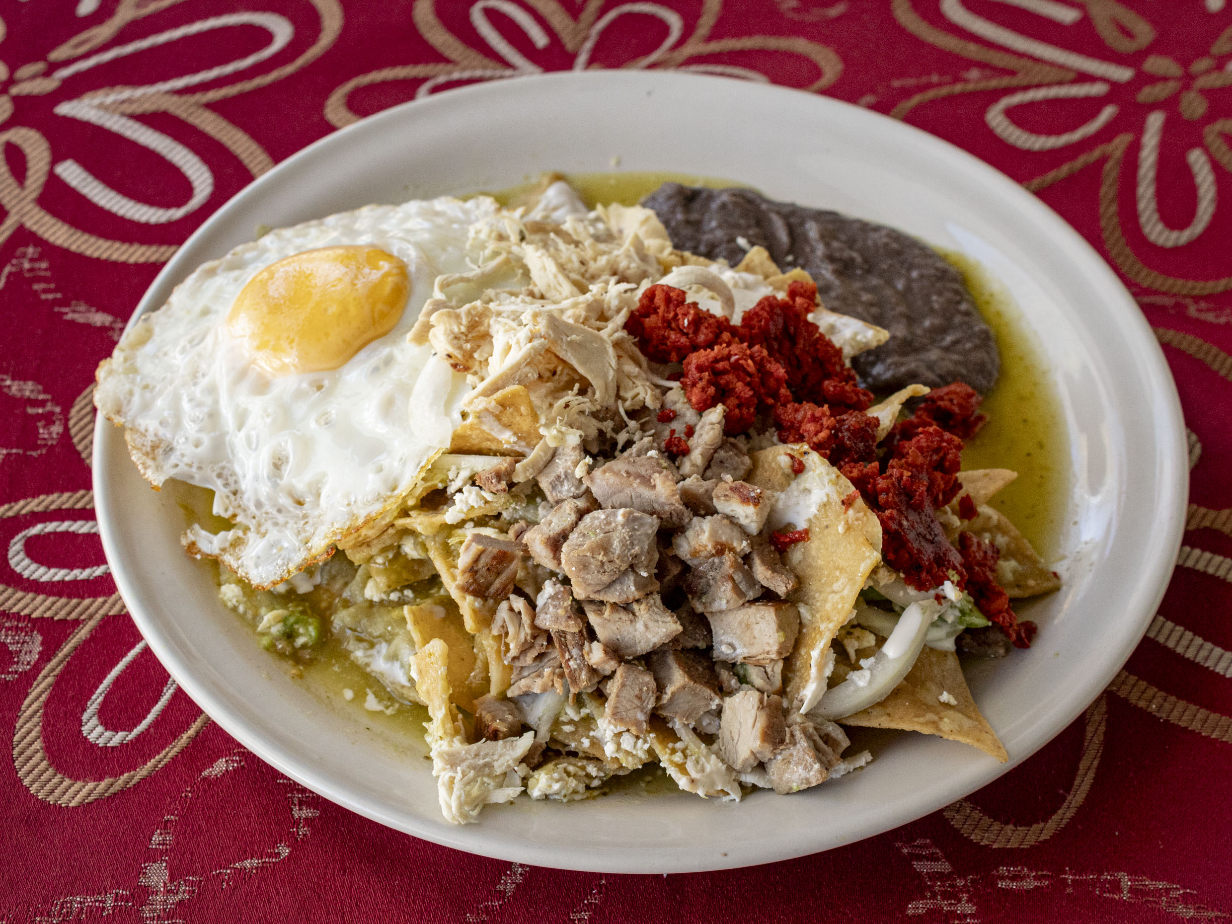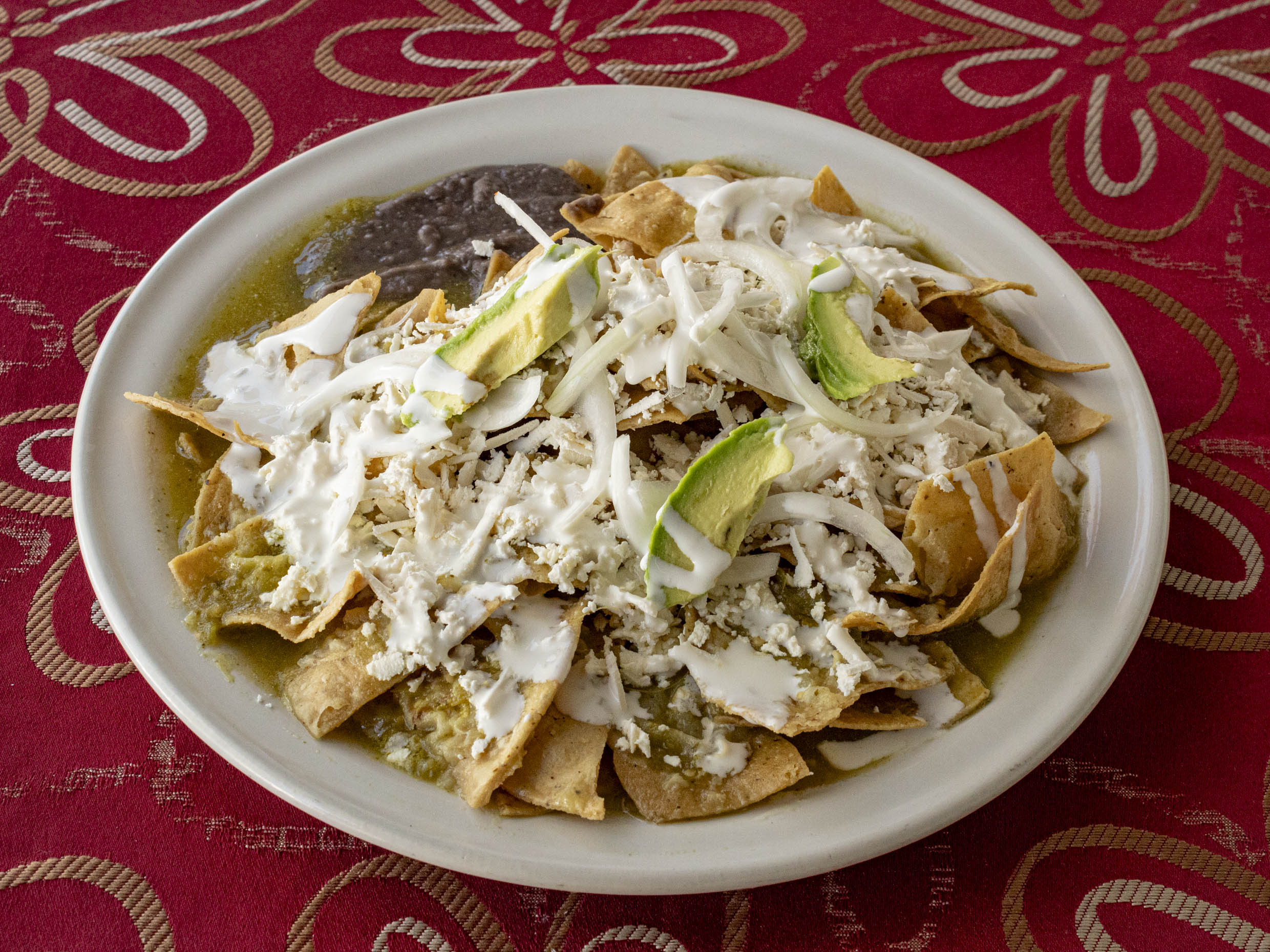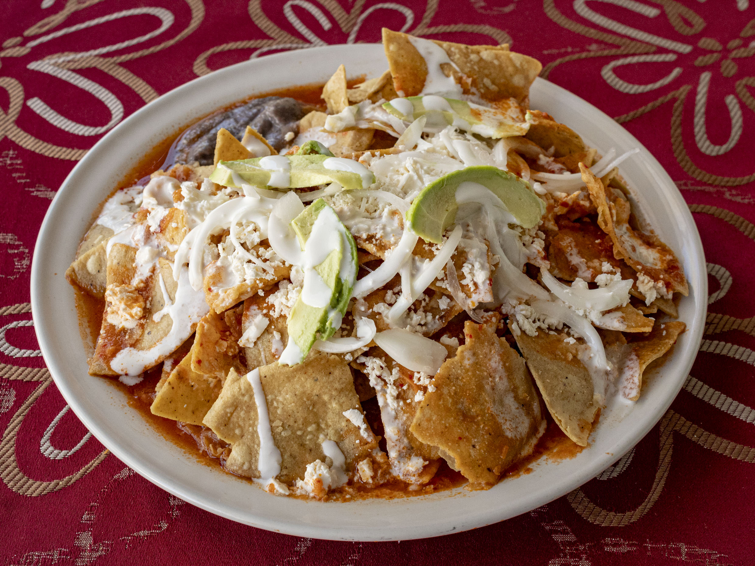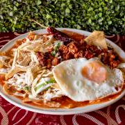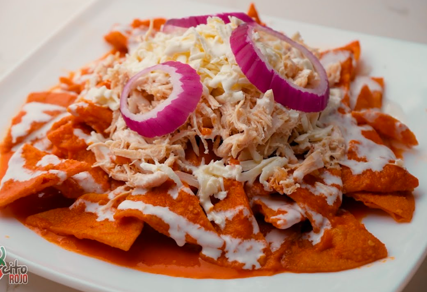 Porcion personal de Chilaquiles Con Pollo incluye totopos de maiz Con queso ranchero , cebolla y frijoles salsa roja o verde