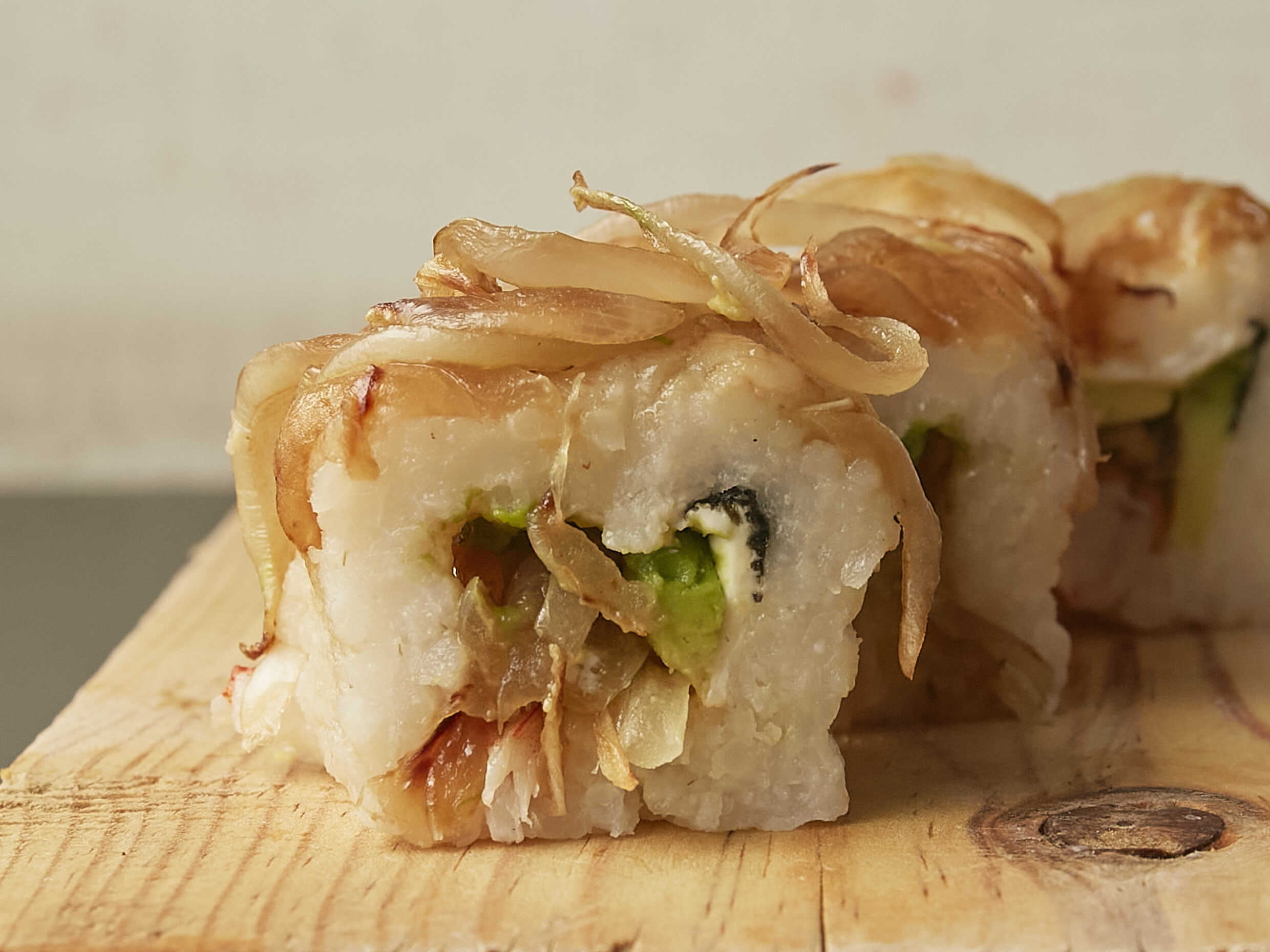 Aguacate, cangrejo, chiles toreados, chorizo y manchego por fuera.