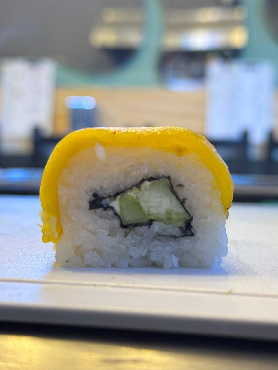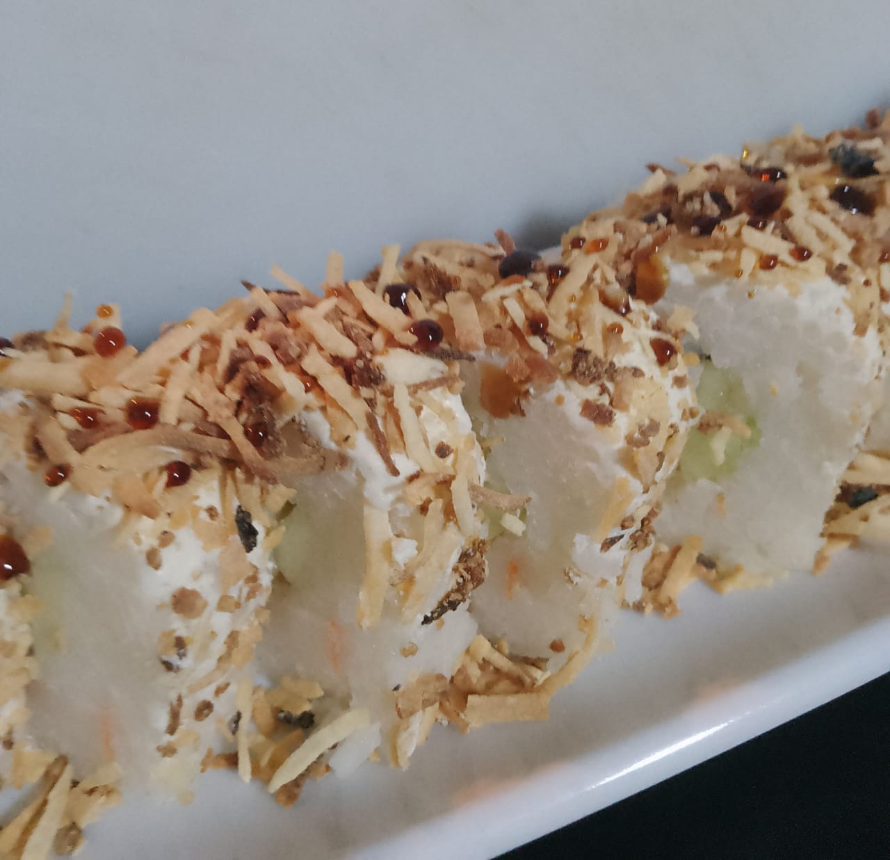 Tampico,salmón, aguacate, pepino, queso y massago por fuera