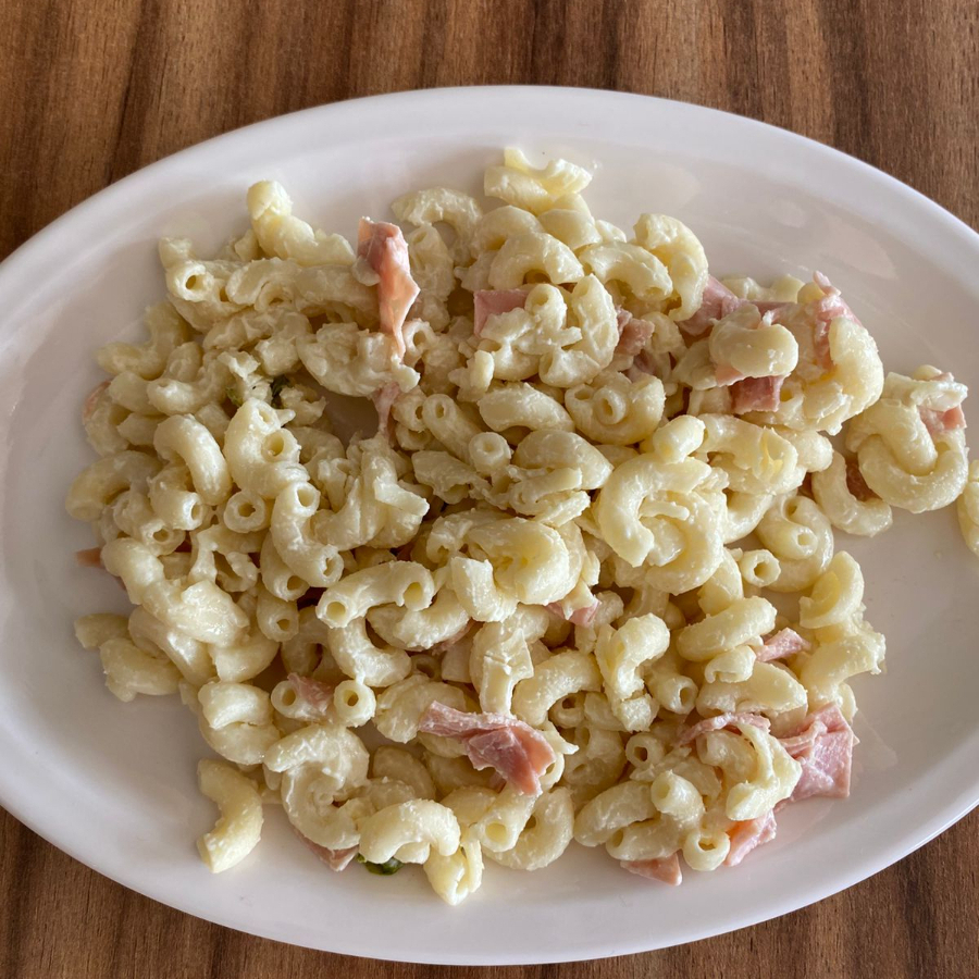Pasta fría con jamón, crema. Refrescante y deliciosa.