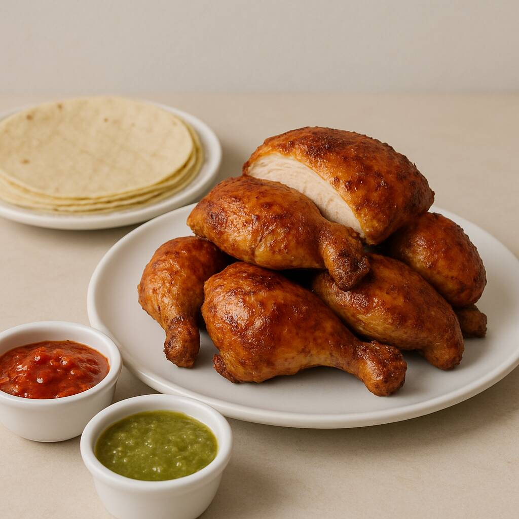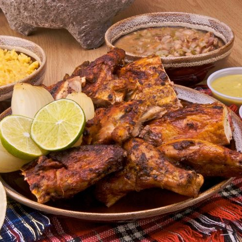 Marinado especial con achiote, piña y especias, al estilo trompo pero en pollo rostizado.