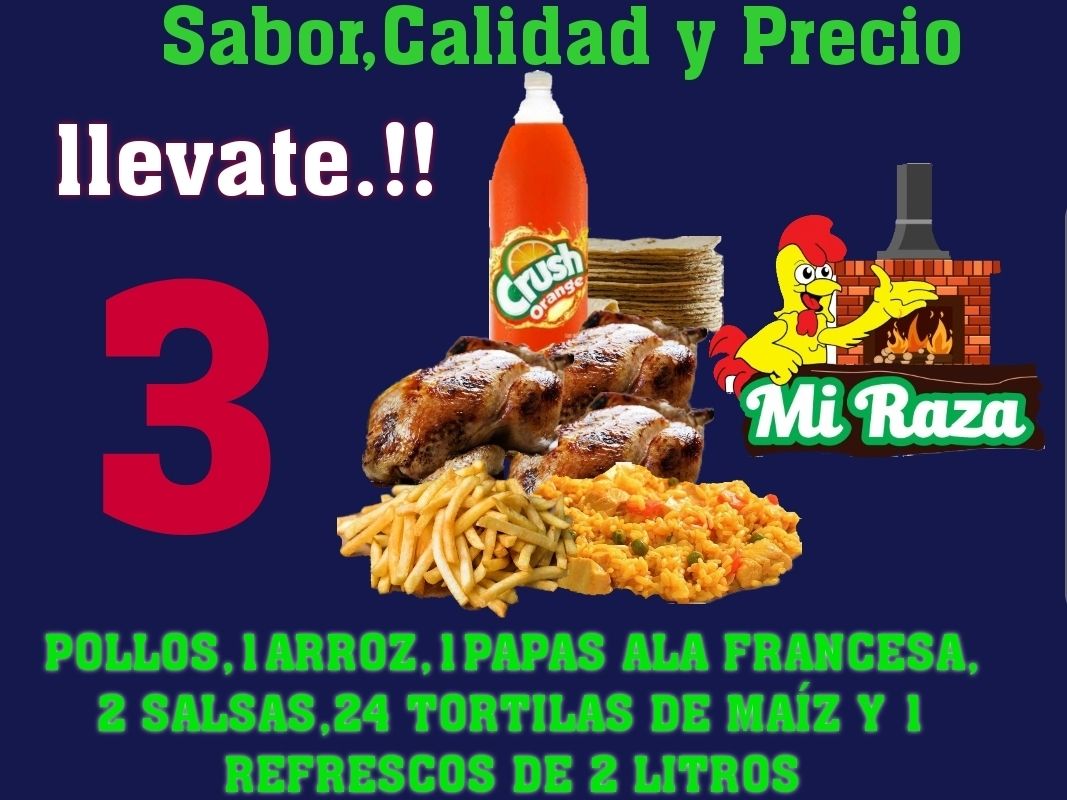 3 Pollos + Acompañamientos 3 Salsas a elegir 24 Tortilas y Refresco 2lt