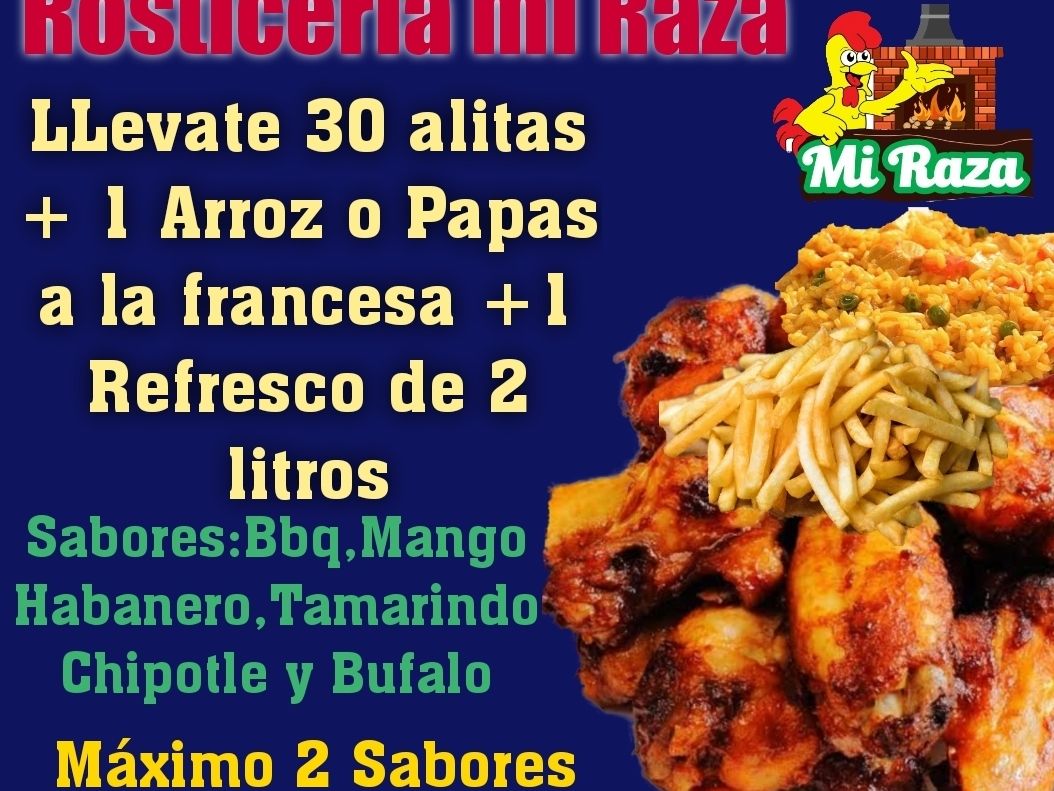 20 Alitas de Pollo, 1 arroz o papas a la francesa grandes , 1 refresco de 2 L., 2 salsas (BBQ, mango habanero, búfalo, tamarindo chipotle).