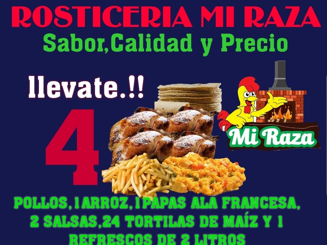 4 Pollos, Acompañamientos, 4 Salsas a elección, 24 Tortillas y Refresco 2lt