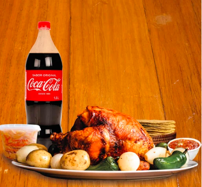 1 Pollo rostizado o ranchero, 1 complemento, 5 pescuezos, 1 bolsa totopos, 1 vaso de salsa más 1 refresco familiar.