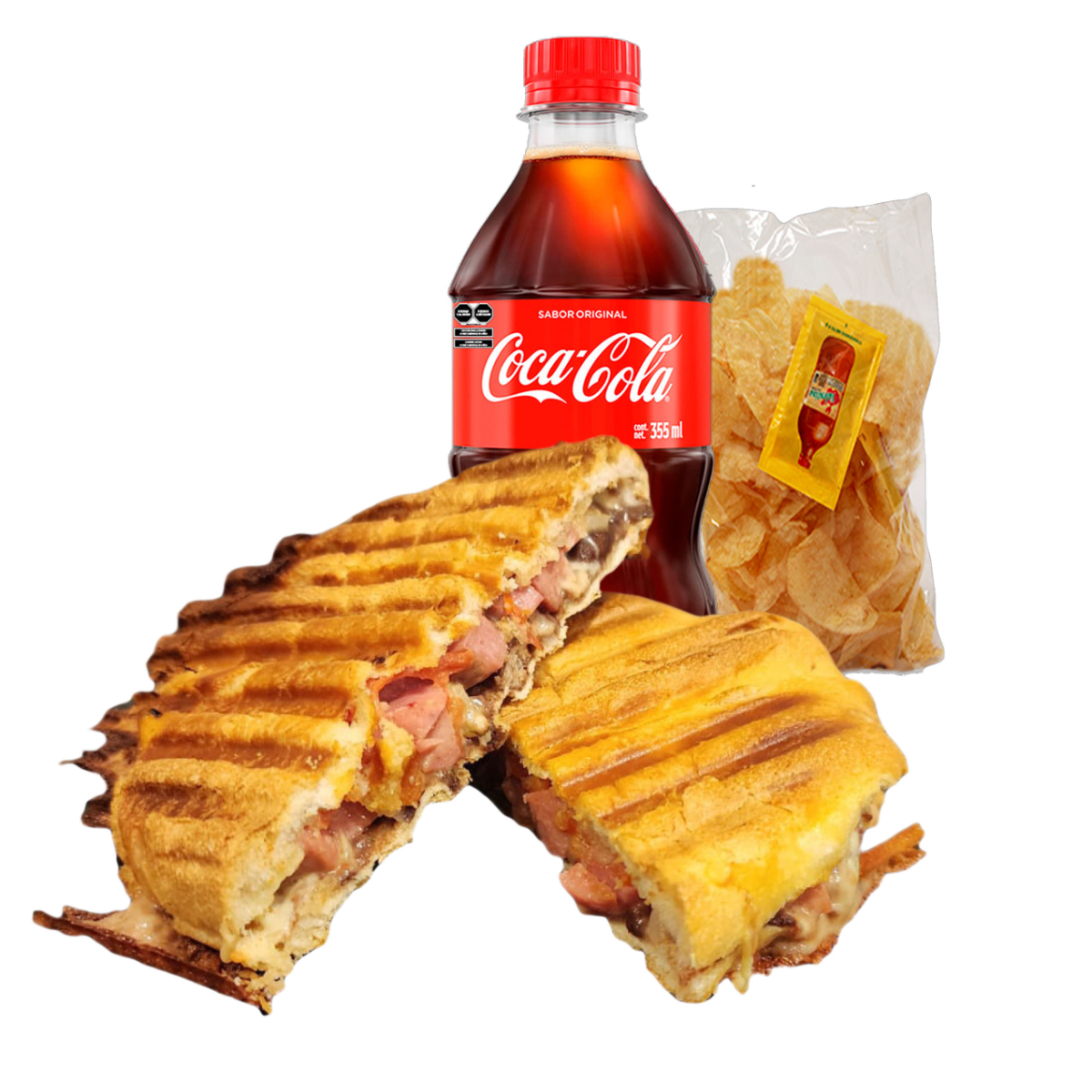 Torta planchada jamón de cerdo, queso manchego, frijoles refritos caseros, mayonesa, mostaza, jitomate, aguacate y picante (salsa jalapeño o salsa chipotle) acompañada de una coca zero 355 ml y una bolsa de papitas tipo chips caseras de 22 gr.