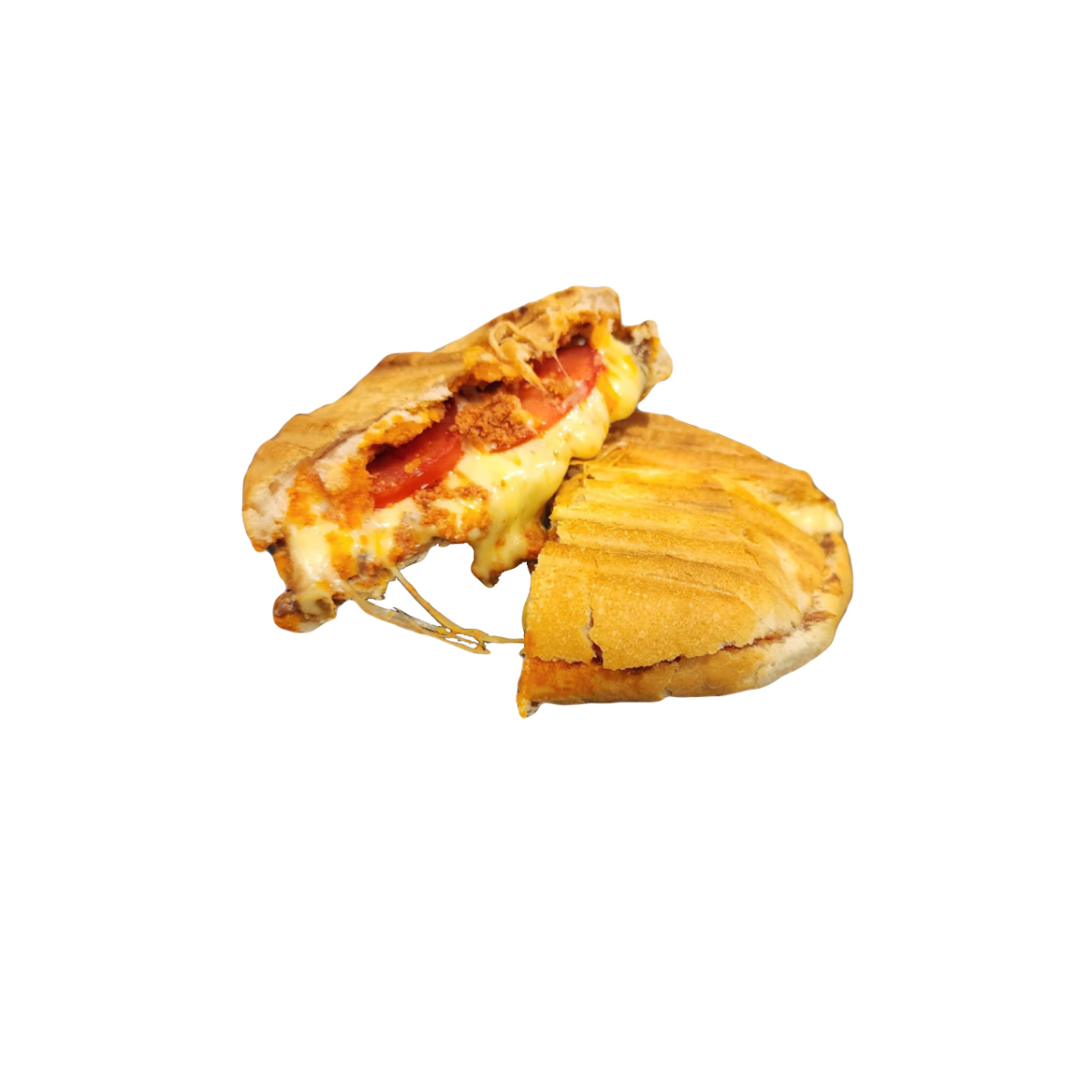 Torta planchada de chorizo con huevo, queso manchego, frijoles refritos caseros, mayonesa jitomate, aguacate y picante (salsa jalapeño o salsa chipotle)
