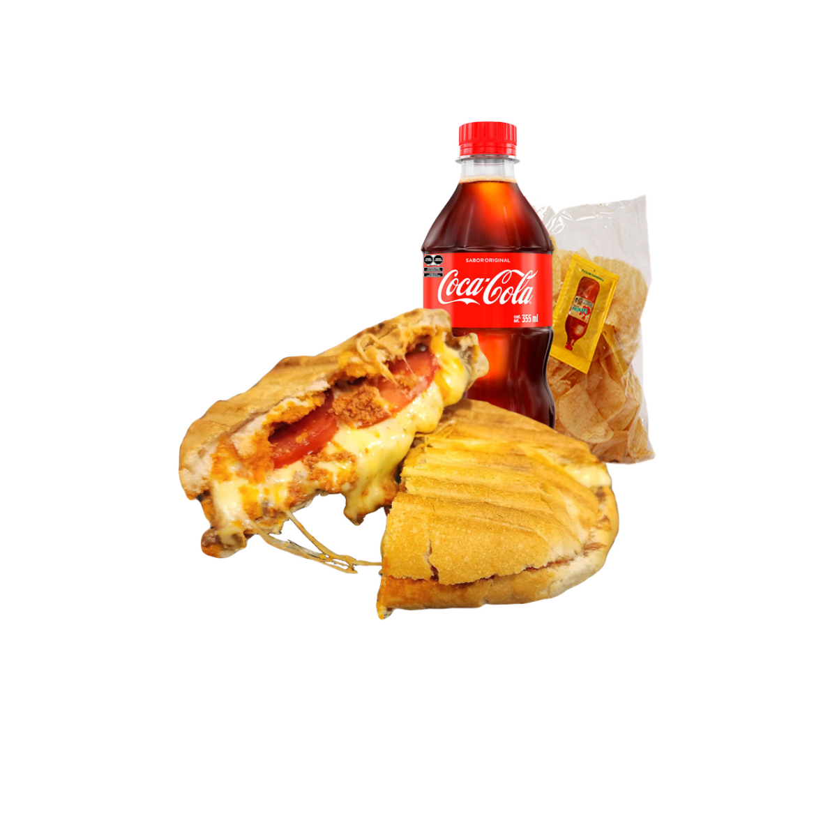 Torta planchada de salchicha viena, queso manchego, frijoles refritos caseros, mayonesa, jitomate, aguacate y picante (salsa jalapeño o salsa chipotle) acompañada de una coca zero 355 ml y una bolsa de papitas tipo chips caseras de 22 gr.