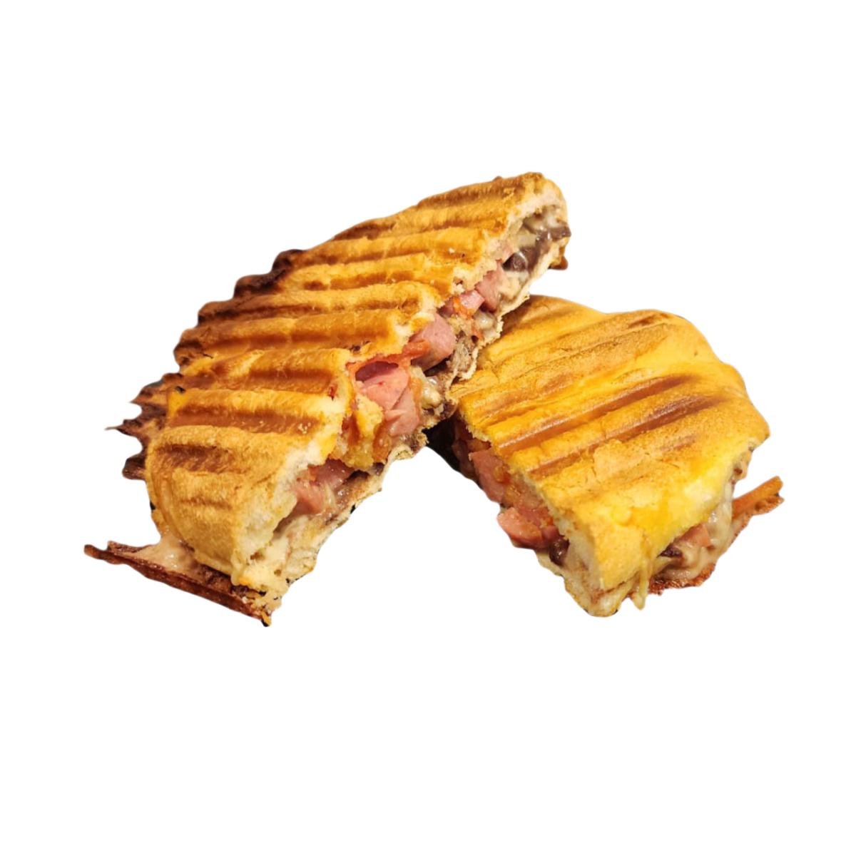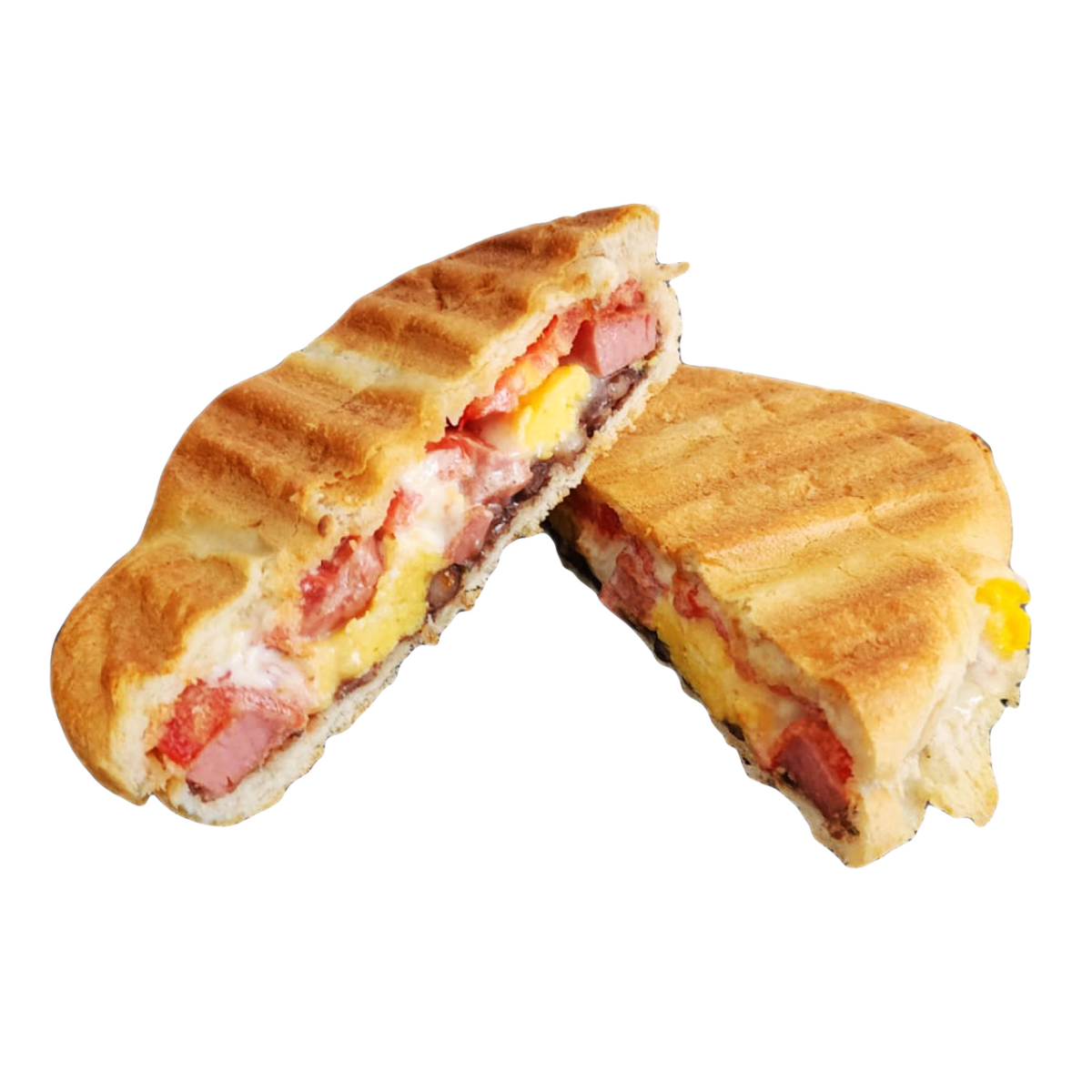 Torta planchada de jamón de cerdo, queso manchego, frijoles refritos caseros, mayonesa, mostaza, jitomate, aguacate y picante (salsa jalapeño o salsa chipotle)