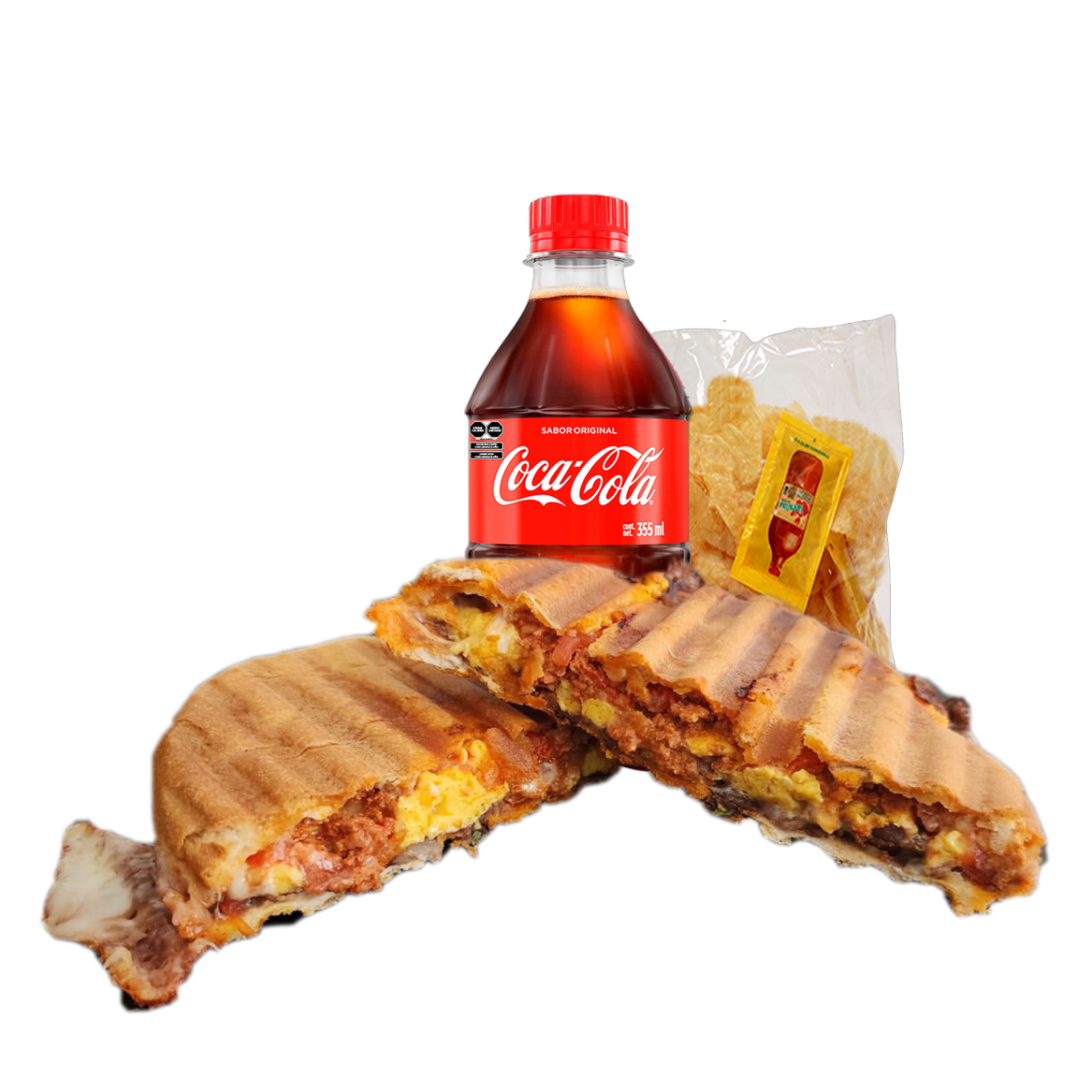 Torta planchada de huevo con chorizo, queso manchego, frijoles refritos caseros, mayonesa, jitomate, aguacate y picante (salsa jalapeño o salsa chipotle) acompañada de una coca zero 355 ml y una bolsa de papitas tipo chips caseras de 22 gr.