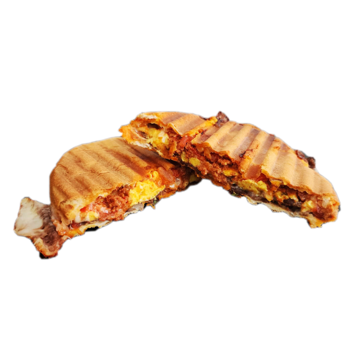 Torta planchada de huevo con chorizo, queso manchego, frijoles refritos caseros, mayonesa, jitomate, aguacate y picante (salsa jalapeño o salsa chipotle)