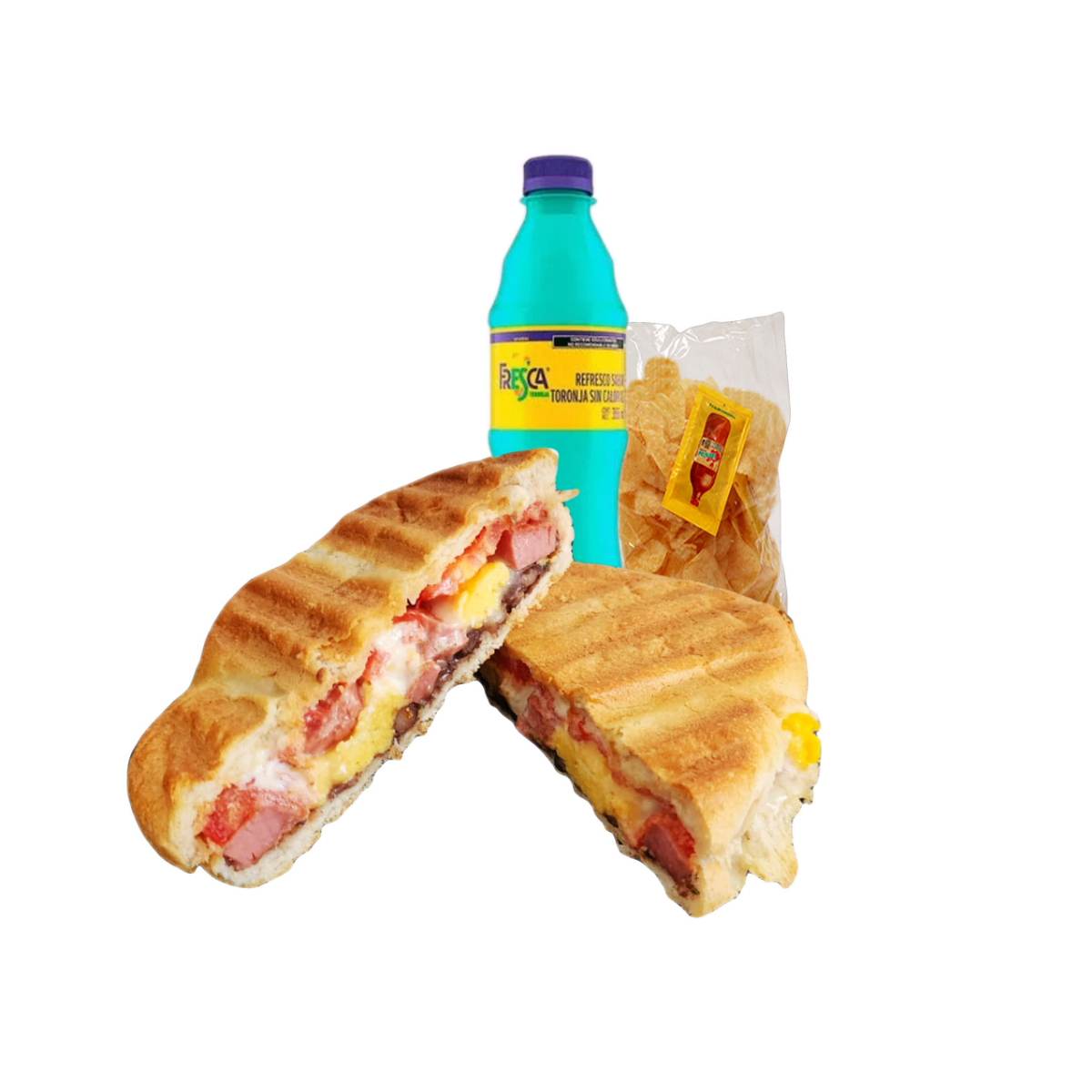 Torta planchada de jamón de cerdo, queso manchego, frijoles refritos caseros, mayonesa, jitomate, aguacate y picante (salsa jalapeño o salsa chipotle) acompañada de una Frezca sin azúcar de 355 ml y una bolsa de papitas tipo chip de 22 gr.