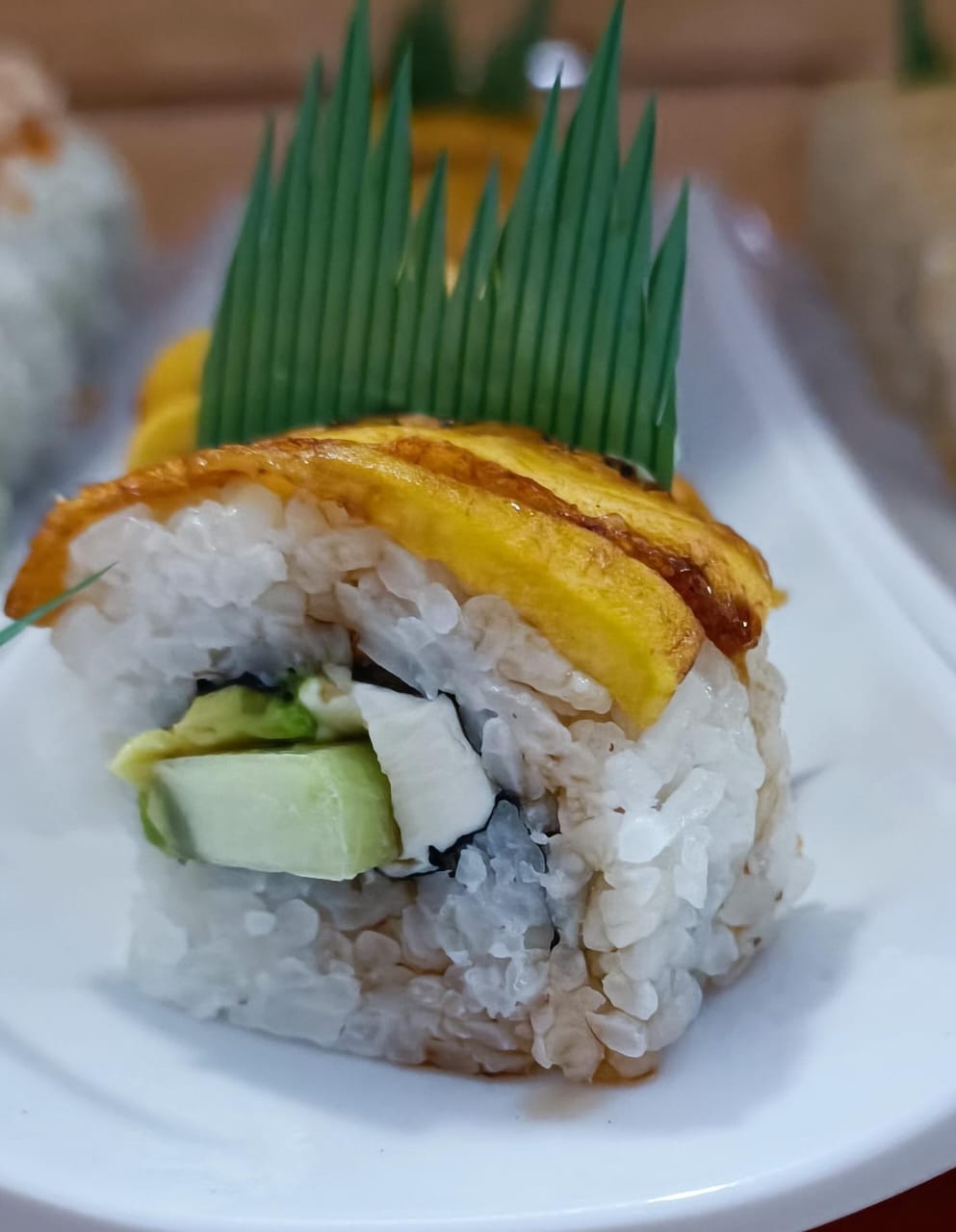 Aguacate, pepino y queso philadelphia, con plátano macho frito bañado en salsa de anguila.