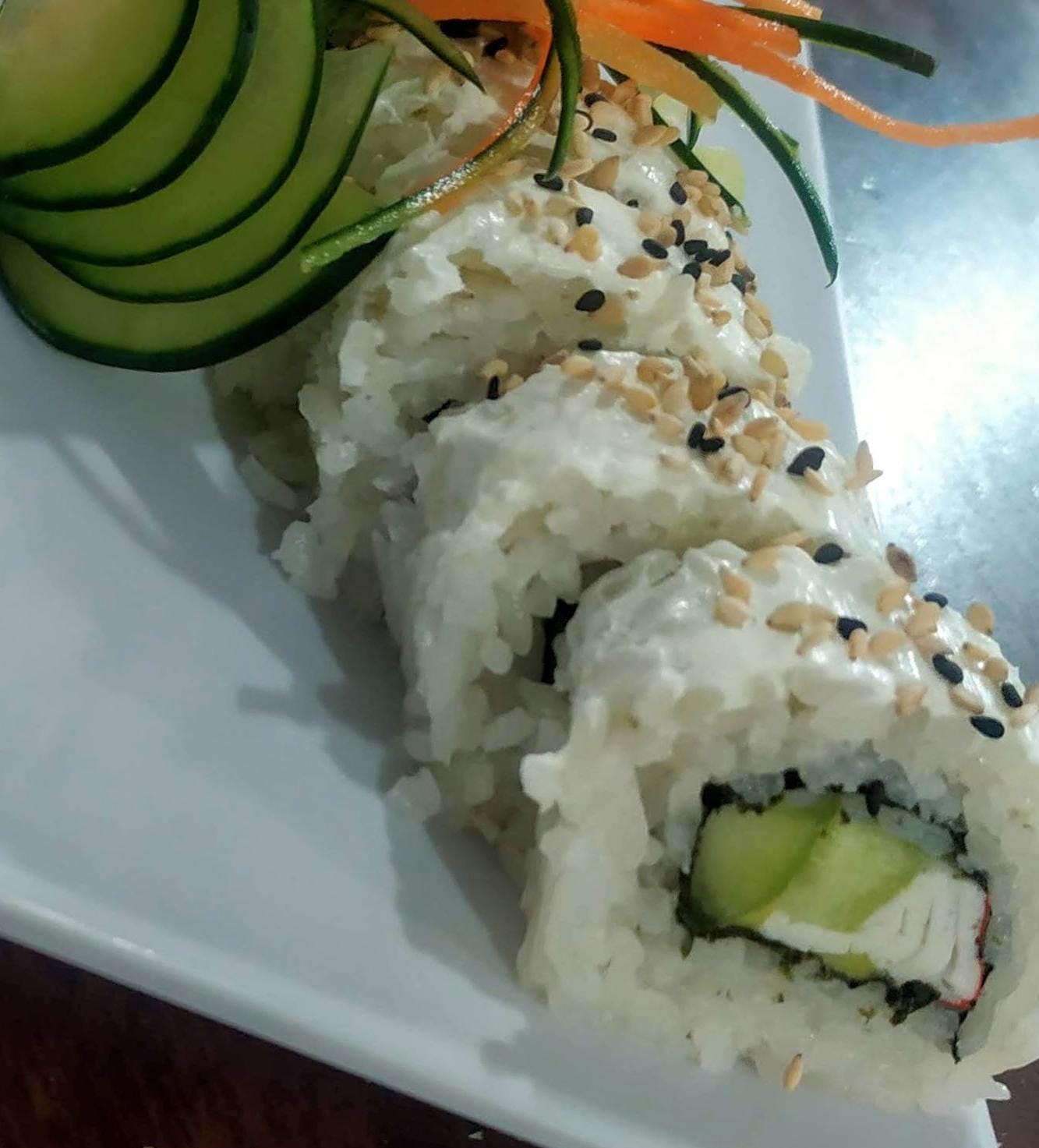 Surimi, aguacate, pepino y queso philadelphia con ajonjolí mixto.