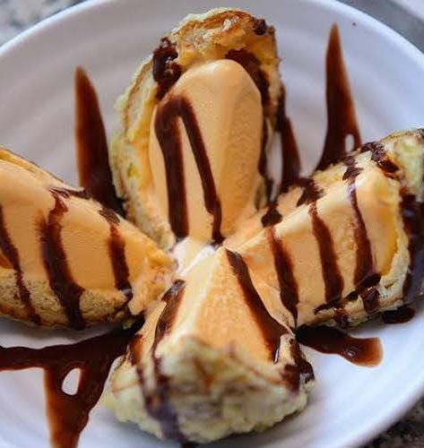 Delicioso helado frito con un crujiente rebozado, bañado en aderezo de fresa.