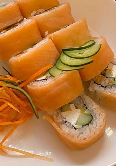 Relleno de masago, aguacate, pepino y queso philadelphia, con salmón bañado en salsa de anguila.