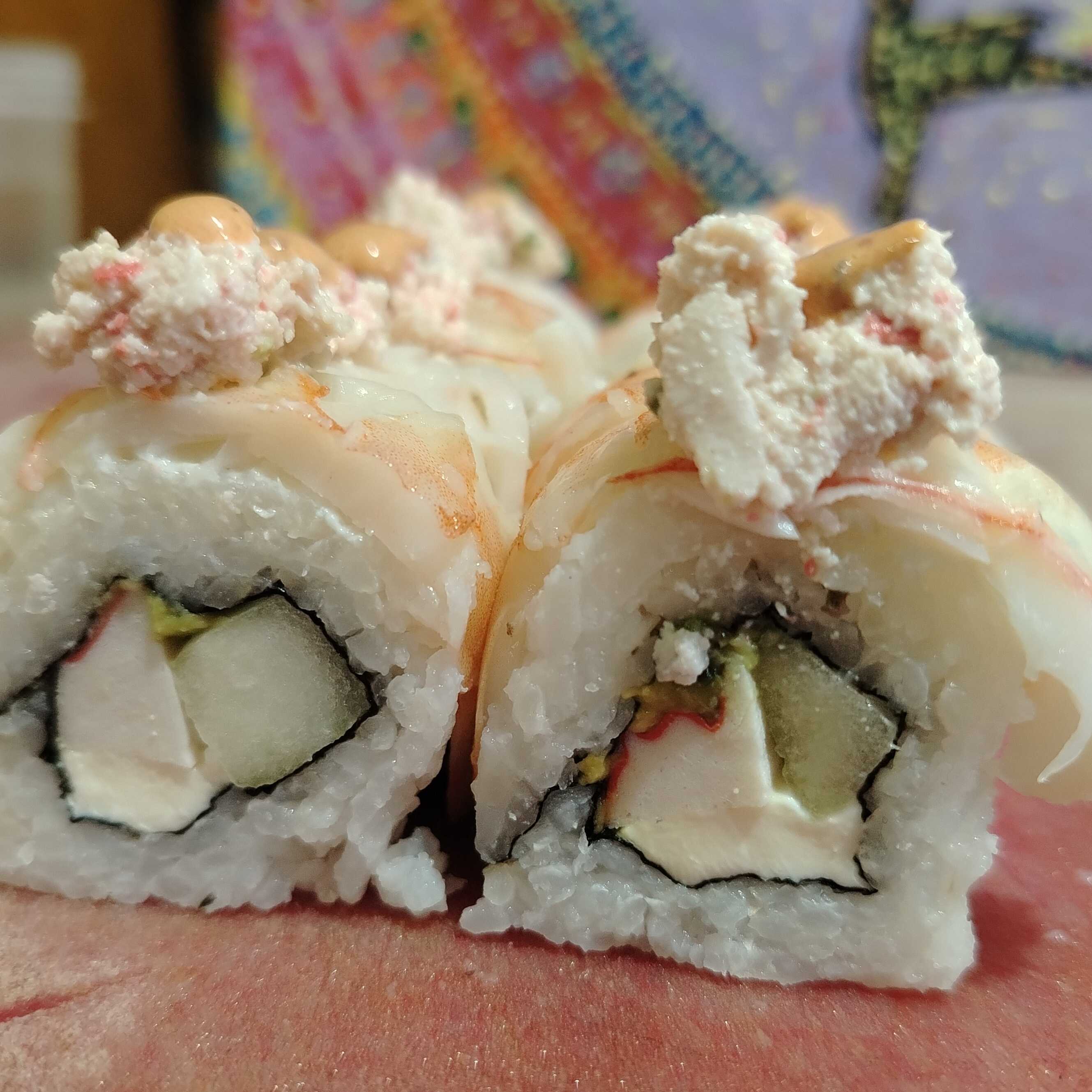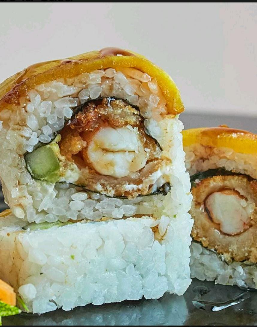 Relleno de surimi, aguacate, pepino y queso philadelphia, con camarón, aderezo tampico y aderezo chipotle.