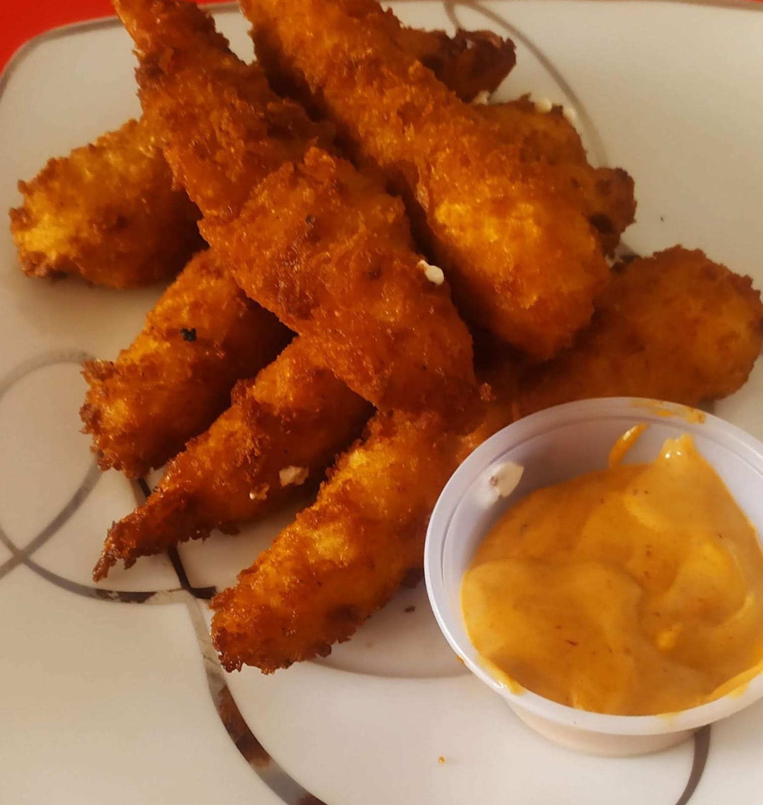6 Piezas de camarones empanizados rellenos de queso philadelphia, acompañados de aderezo chipotle.