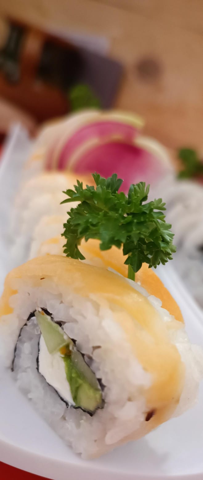 Relleno de masago, pepino, aguacate, queso philadelphia y chiles toreados, con aguacate y salmón acompañados de aderezo chipotle.