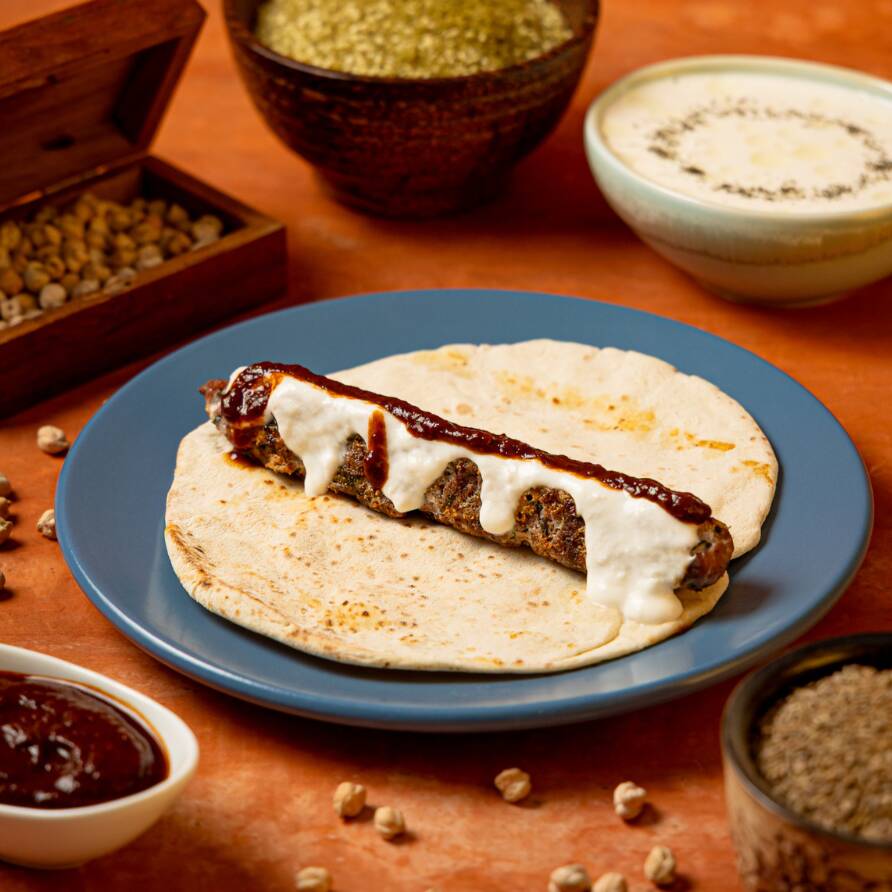 120 grs de Kafta (carne molida de res preparada), servida en un pan árabe grande y acompañada con jocoque y salsa árabe.
