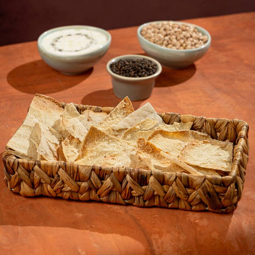 Caja con 8 trozos de pan tostado al natural, perfecto para hummus (garbanza molida), baba ganoush (berenjena ahumada molida) y jocoque.