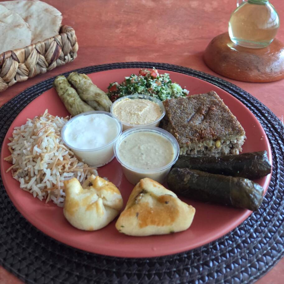Variedad de delicias árabes para probar de todo un poco. Incluye: 1 kibbeh bola cuadro, 2 hojas parra, 2 tacos de col, 2 empanadas botaneras surtidas, arroz con fideo, taboule, jocoque, hummus y berenjena molida.
