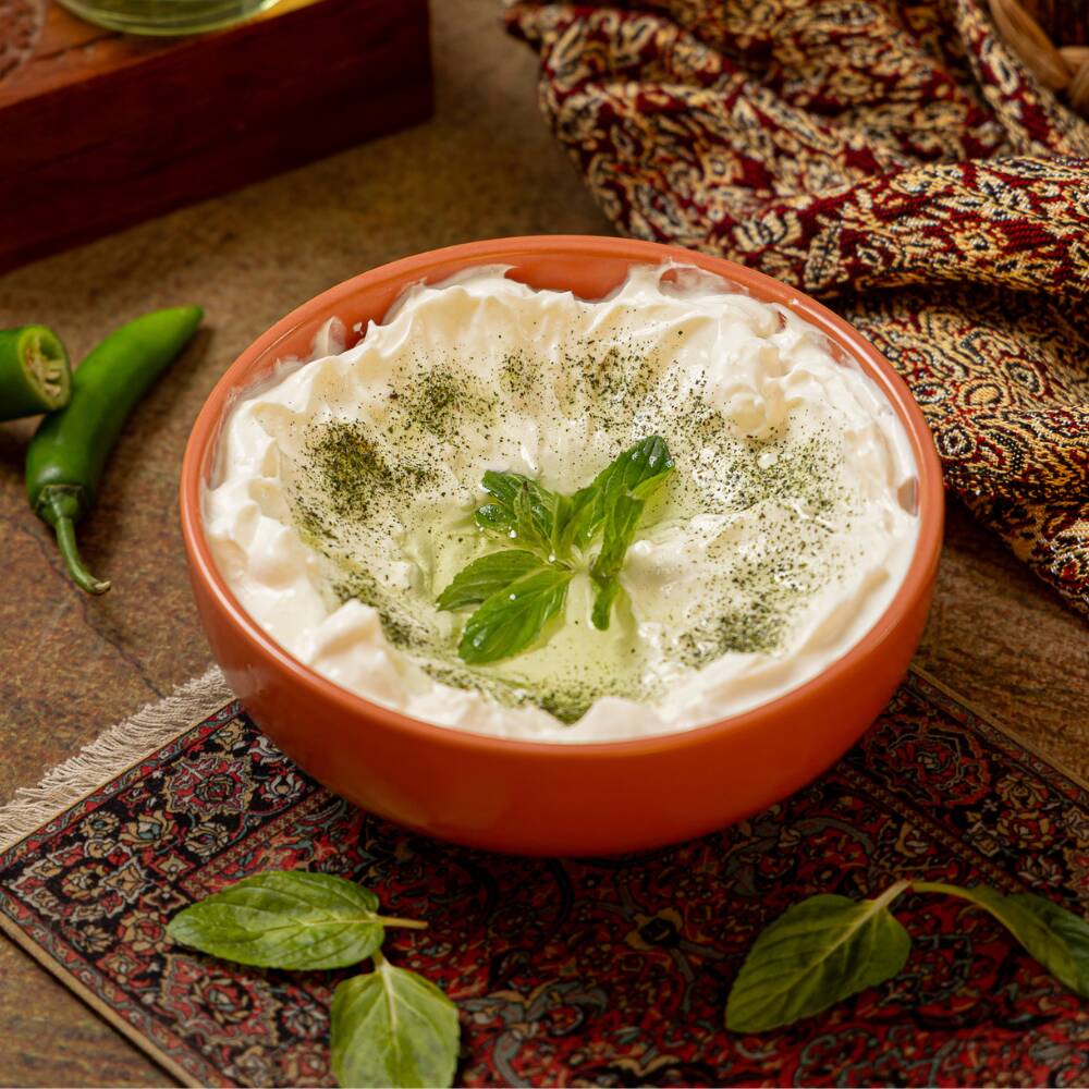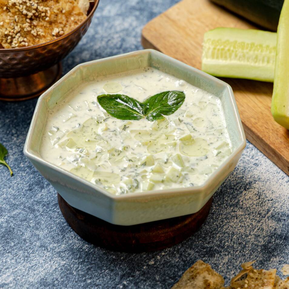 Fresca combinación de pepino en cubitos en jocoque preparado con ajo y hierbabuena. Un básico de la comida árabe. (220 grs)