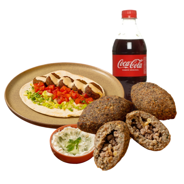 Kibbeh Árabe Bola Botanero*1 + Kebab de Falafel*1 + Porción Individual de Jocoque*1 + Coca Cola 600 ml*1