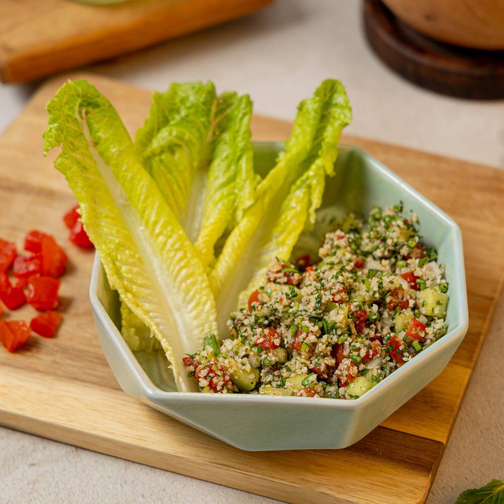 Ensalada típica de la comida árabe tradicional hecha con una mezcla de pepino, jitomate, hierbabuena, perejil, trigo y nuestro aderezo especial, acompañada de una crujiente hoja de lechuga. (190 grs)